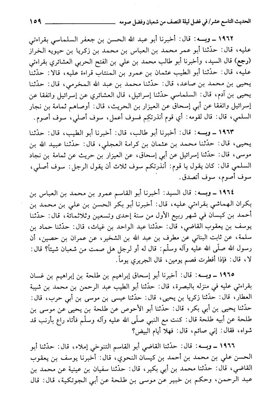 1964 - أَخْبَرَنَا أَبُو الْقَاسِمِ عَمْرُو بْنُ مُحَمَّدِ بْنِ الْعَبَّاسِ بْنِ بَكْرَانَ الْهَمَّاشِيُّ , بِقِرَاءَتِي عَلَيْهِ، قَالَ: أَخْبَرَنَا أَبُو بَكْرٍ الْحَسَنُ بْنُ عَلِيِّ بْنِ مُحَمَّدِ بْنِ أَحْمَدَ بْنِ كَيْسَانَ فِي شَهْرِ رَبِيعٍ الْأَوَّلِ مِنْ سَنَةِ إِحْدَى وَتِسْعِينَ وَثَلاثِ مِائَةٍ، قَالَ: حَدَّثَنَا يُوسُفُ بْنُ يَعْقُوبَ الْقَاضِي، قَالَ: حَدَّثَنَا عَبْدُ الْوَاحِدِ بْنُ غِيَاثٍ، قَالَ: حَدَّثَنَا حَمَّادُ بْنُ سَلَمَةَ، عَنْ ثَابِتٍ الْبُنَانِيِّ، عَنْ مُطَرِّفِ بْنِ عَبْدِ اللَّهِ بْنِ الشِّخِّيرِ، عَنْ عِمْرَانَ بْنِ حُصَيْنٍ، أَنّ رَسُولَ اللَّهِ صَلَّى اللَّهُ عَلَيْهِ وَآلِهِ وَسَلَّمَ، قَالَ لَهُ أَوْ لِرَجُلٍ: " هَلْ صُمْتَ مِنْ شَعْبَانَ شَيْئًا؟ قَالَ: لَا، قَالَ: فإِذَا أَفْطَرْتَ فَصُمْ يَوْمَيْنِ "، قَالَ الْجَرِيرِيُّ: يَوْمًا