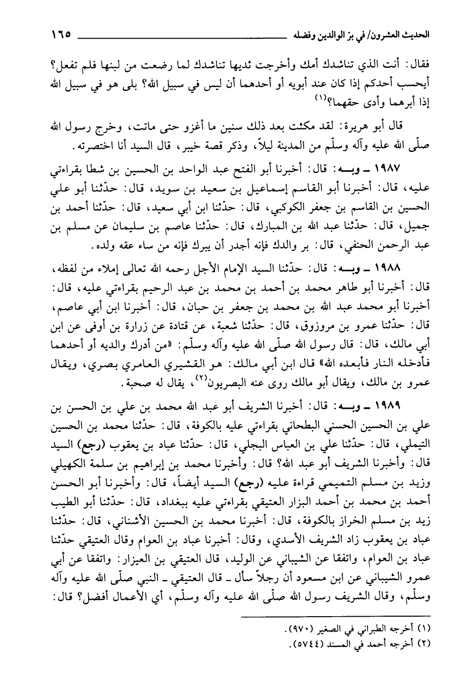 1989 - أَخْبَرَنَا الشَّرِيفُ أَبُو عَبْدِ اللَّهِ مُحَمَّدُ بْنُ عَلِيِّ بْنِ الْحَسَنِ بْنِ عَلِيِّ بْنِ الْحُسَيْنِ الْحَسَنِيُّ الْبَطْحَانِيُّ , بِقِرَاءَتِي عَلَيْهِ بِالْكُوفَةِ، قَالَ: حَدَّثَنَا مُحَمَّدُ بْنُ الْحُسَيْنِ التَّيْمُلِيُّ، قَالَ: حَدَّثَنَا عَلِيُّ بْنُ الْعَبَّاسِ الْبَجْلِيُّ، قَالَ: حَدَّثَنَا عَبَّادُ بْنُ يَعْقُوبَ , رَجَعَ السَّيِّدُ , قَالَ: وَأَخْبَرَنَا الشَّرِيفُ أَبُو عَبْدِ اللَّهِ، قَالَ: وَأَخْبَرَنَا مُحَمَّدُ بْنُ إِبْرَاهِيمَ بْنِ سَلَمَةَ الْكُهَيْلِيُّ، وَزَيْدُ بْنُ مُسْلِمٍ التَّمِيمِيُّ قِرَاءَةً عَلَيْهِ , رَجَعَ السَّيِّدُ أَيْضًا، قَالَ: وَأَخْبَرَنَا أَبُو الْحَسَنِ أَحْمَدُ بْنُ مُحَمَّدِ بْنِ أَحْمَدَ الْبَزَّارُ الْعَتِيقِيُّ , بِقِرَاءَتِي عَلَيْهِ بِبَغْدَادَ، قَالَ: حَدَّثَنَا أَبُو الطَّيِّبِ زَيْدُ بْنُ مُسْلِمٍ الْخَزَّارُ , بِالْكُوفَةِ، قَالَ: أَخْبَرَنَا مُحَمَّدُ بْنُ الْحُسَيْنِ الْأُشْنَانِيُّ، قَالَ: حَدَّثَنَا عَبَّادُ بْنُ يَعْقُوبَ , زَادُ الشَّرِيفِ الْأَسَدِيُّ، وَقَالَ أَخْبَرَنَا عَبَّادُ بْنُ الْعَوَّامِ، وَقَالَ الْعَتِيقِيُّ، حَدَّثَنَا عَبَّادُ بْنُ الْعَوَّامِ، وَاتَّفَقَا عَنِ الشَّيْبَانِيِّ، عَنِ الْوَلِيدِ، قَالَ الْعَتِيقِيُّ بْنُ الْعِيزَارِ وَاتَّفَقَا عَنْ أَبِي عَمْرٍو الشَّيْبَانِيِّ، عَنِ ابْنِ مَسْعُودٍ، أَنَّ رَجُلًا سَأَلَ , قَالَ الْعَتِيقِيُّ , النَّبِيَّ صَلَّى اللَّهُ عَلَيْهِ وَآلِهِ وَسَلَّمَ، وَقَالَ الشَّرِيفُ: رَسُولَ اللَّهِ صَلَّى اللَّهُ عَلَيْهِ وَآلِهِ وَسَلَّمَ: " أَيُّ الْأَعْمَالِ أَفْضَلُ؟ قَالَ:
