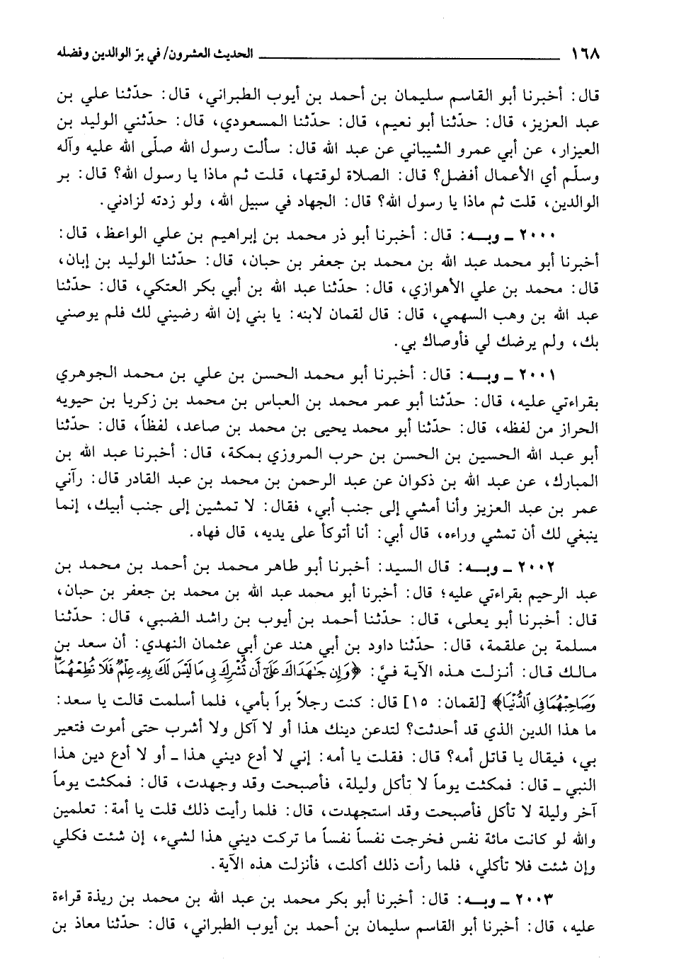 قَالَ: أَخْبَرَنَا أَبُو الْقَاسِمِ سُلَيْمَانُ بْنُ أَحْمَدَ بْنِ أَيُّوبَ الطَّبَرَانِيُّ، قَالَ: حَدَّثَنَا عَلِيُّ بْنُ عَبْدِ الْعَزِيزِ، قَالَ: حَدَّثَنَا أَبُو نُعَيْمٍ، قَالَ: حَدَّثَنَا الْمَسْعُودِيُّ، قَالَ: حَدَّثَنِي الْوَلِيدُ بْنُ الْعِيزَارِ، قَالَ: عَنْ أَبِي عَمْرٍو الشَّيْبَانِيِّ، عَنْ عَبْدِ اللَّهِ قَالَ: سَأَلْتُ رَسُولَ اللَّهِ صَلَّى اللَّهُ عَلَيْهِ وَآلِهِ وَسَلَّمَ: " أَيُّ الْأَعْمَالِ أَفْضَلُ؟ ، قَالَ: الصَّلَاةُ لِوْقِتَها، قُلْتُ: ثُمَّ مَاذَا يَا رَسُولَ اللَّهِ؟ قَالَ: بِرُّ الْوَالِدَيْنِ، قُلْتُ: ثُمَّ مَاذَا يَا رَسُولَ اللَّهِ؟ قَالَ: الْجِهَادُ فِي سَبِيلِ اللَّهِ "، وَلَوْ زِدْتُهُ لَزَادَنِي