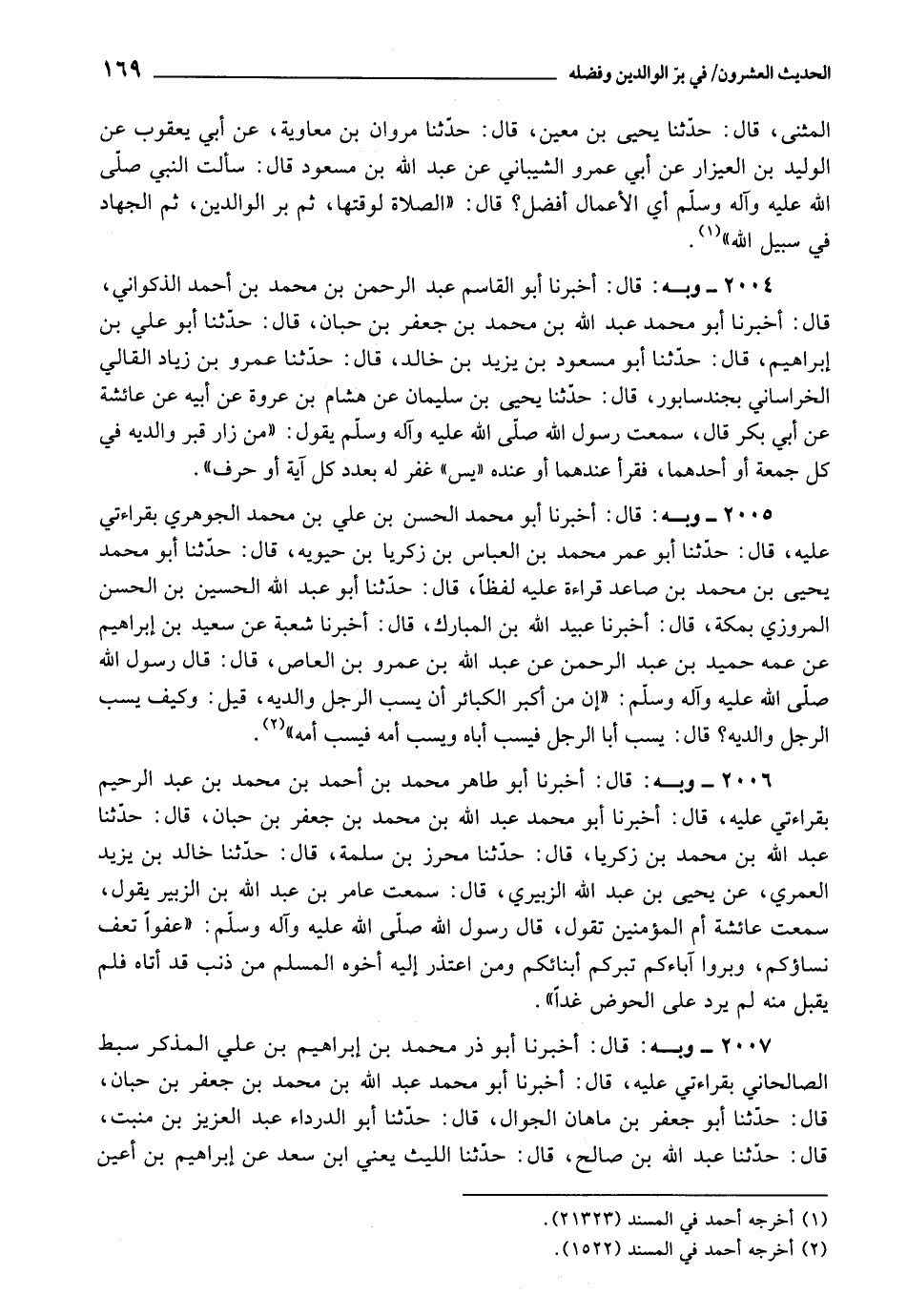 2005 - أَخْبَرَنَا أَبُو مُحَمَّدٍ الْحَسَنُ بْنُ عَلِيِّ بْنِ مُحَمَّدٍ الْجَوْهَرِيُّ بِقِرَاءَتِي عَلَيْهِ، قَالَ: حَدَّثَنَا أَبُو عُمَرَ مُحَمَّدُ بْنُ الْعَبَّاسِ بْنِ زَكَرِيَّا بْنِ حَيُّوَيْهِ، قَالَ: حَدَّثَنَا أَبُو مُحَمَّدٍ يَحْيَى بْنُ مُحَمَّدِ بْنِ صَاعِدٍ , قِرَاءَةً عَلَيْهِ لَفْظًا، قَالَ: حَدَّثَنَا أَبُو عَبْدِ اللَّهِ الْحُسَيْنُ بْنُ الْحَسَنِ الْمَرْوَزِيُّ بِمَكَّةَ، قَالَ: أَخْبَرَنَا عُبَيْدُ اللَّهِ بْنُ الْمُبَارَكِ، قَالَ: أَخْبَرَنَا شُعْبَةُ، عَنْ سَعِيدِ بْنِ إِبْرَاهِيمَ، عَنْ عَمِّهِ، عَنْ حُمَيْدِ بْنِ عَبْدِ الرَّحْمَنِ، عَنْ عَبْدِ اللَّهِ بْنِ عَمْرِو بْنِ الْعَاصِ، قَالَ: قَالَ رَسُولُ اللَّهِ صَلَّى اللَّهُ عَلَيْهِ وَآلِهِ وَسَلَّمَ: " إِنَّ مِنْ أَكْبَرِ الْكَبَائِرِ أَنْ يَسُبَّ الرَّجُلُ وَالِدَيْهِ، قِيلَ: وَكَيْفَ يَسُبُّ الرَّجُلُ وَالِدَيْهِ؟ قَالَ: يَسُبُّ أَبَا الرَّجُلِ , فَيَسُبُّ أَبَاهُ، وَيَسُبُّ أُمَّهُ فَيَسُبُّ أُمَّهُ "