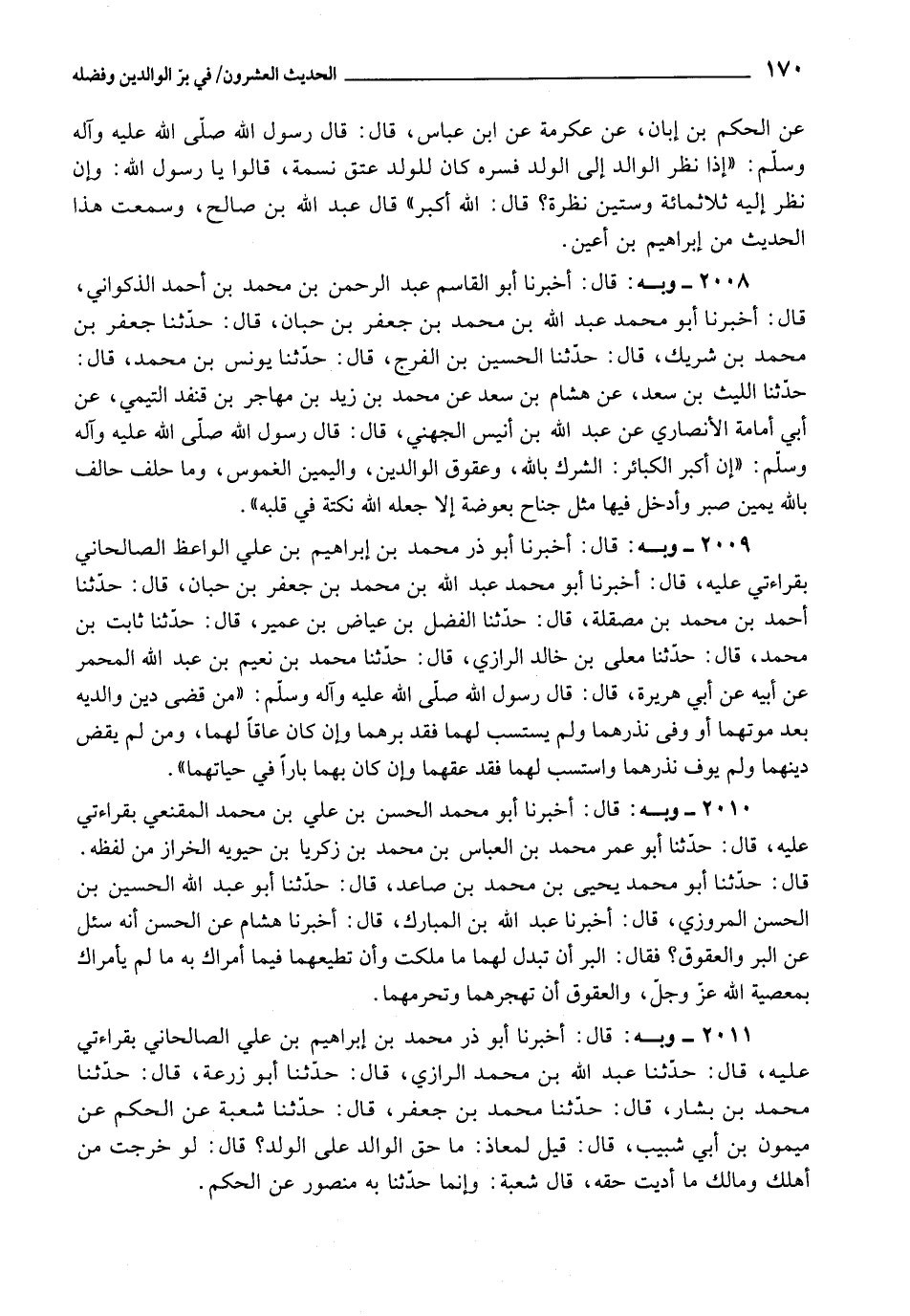 2009 - أَخْبَرَنَا أَبُو ذَرٍّ مُحَمَّدُ بْنُ إِبْرَاهِيمَ بْنِ عَلِيٍّ الْوَاعِظُ الصَّالِحَانِيُّ , قِرَاءَتِي عَلَيْهِ، قَالَ: أَخْبَرَنَا أَبُو مُحَمَّدٍ عَبْدُ اللَّهِ بْنُ مُحَمَّدِ بْنِ جَعْفَرِ بْنِ حِبَّانَ، قَالَ: حَدَّثَنَا أَحْمَدُ بْنُ مُحَمَّدِ بْنِ مُصْقَلَةَ، قَالَ: حَدَّثَنَا الْفَضْلُ بْنُ عِيَاضِ بْنِ عُمَيْرٍ، قَالَ: حَدَّثَنَا ثَابِتُ بْنُ مُحَمَّدٍ، قَالَ: حَدَّثَنَا مُعَلَّي بْنُ خَالِدٍ الرَّازِيُّ، قَالَ: حَدَّثَنَا مُحَمَّدُ بْنُ نُعَيْمِ بْنِ عَبْدِ اللَّهِ الْمُحْمِرُ، عَنْ أَبِيهِ، عَنْ أَبِي هُرَيْرَةَ، قَالَ: قَالَ رَسُولُ اللَّهِ صَلَّى اللَّهُ عَلَيْهِ وَآلِهِ وَسَلَّمَ: «مَنْ قَضَى دَيْنَ وَالِدَيْهِ بَعْدَ مَوْتِهِمَا، أَوْ وَفَّى نَذْرَهُمَا , لَمْ يَسْتَسِبَّ لَهُمَا , قَدْ بَرَّهُمَا، وَإِنْ كَانَ عَاقًّا لَهُمَا، وَمَنْ لَمْ يَقْضِ دَيْنَهُمَا، وَلَمْ يُوَفِّ نَذْرَهُمَا , اسْتَسَبَّ لَهُمَا , قَدْ عَقَّهُمَا , إِنْ كَانَ بَارًّا بِهِمَا فِي حَيَاتِهِمَا»