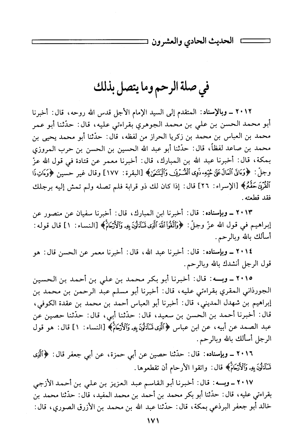 2015 - قَالَ: أَخْبَرَنَا أَبُو بَكْرٍ مُحَمَّدُ بْنُ عَلِيِّ بْنِ أَحْمَدَ بْنِ الْحُسَيْنِ الْجُوزْدَانِيُّ , الْمُقْرِيُّ بِقِرَاءَتِي عَلَيْهِ، قَالَ: أَخْبَرَنَا أَبُو مُسْلِمٍ عَبْدُ الرَّحْمَنِ بْنُ مُحَمَّدِ بْنِ إِبْرَاهِيمَ بْنِ شَهْدَلٍ الْمَدِينِيُّ، قَالَ: أَخْبَرَنَا أَبُو الْعَبَّاسِ أَحْمَدُ بْنُ مُحَمَّدِ بْنِ عَقْدَةَ الْكُوفِيُّ، قَالَ: أَخْبَرَنَا أَحْمَدُ بْنُ الْحَسَنِ بْنِ سَعِيدٍ، قَالَ: حَدَّثَنِي أَبِي، قَالَ: حَدَّثَنَا حُصَيْنٌ، عَنْ عَبْدِ الصَّمَدِ، عَن أَبِيهِ، عَنِ ابْنِ عَبَّاسٍ " {الَّذِي تَسَاءَلُونَ بِهِ وَالأَرْحَامَ} [النساء: 1] ، قَالَ: هُوَ قَوْلُ الرَّجُلِ: أَسْأَلُكَ بِاللَّهِ , وَبِالرَّحِمِ "