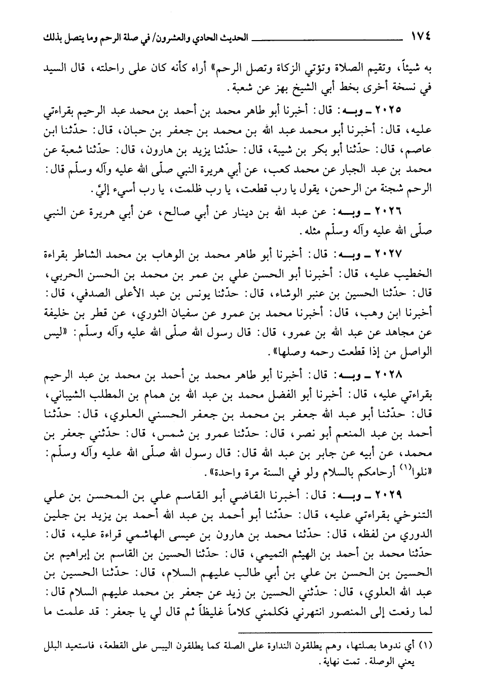 2028 - أَخْبَرَنَا أَبُو طَاهِرٍ مُحَمَّدُ بْنُ أَحْمَدَ بْنِ مُحَمَّدِ بْنِ عَبْدِ الرَّحِيمِ , بِقِرَاءَتِي عَلَيْهِ، قَالَ: أَخْبَرَنَا أَبُو الْفَضْلِ مُحَمَّدُ بْنُ عَبْدِ اللَّهِ بْنِ هَمَّامِ بْنِ الْمُطَّلِبِ الشَّيْبَانِيُّ، قَالَ: حَدَّثَنَا أَبُو عَبْدِ اللَّهِ جَعْفَرُ بْنُ مُحَمَّدِ بْنِ جَعْفَرٍ الْحَسَنِيُّ الْعَلَوِيُّ، قَالَ: حَدَّثَنَا أَحْمَدُ بْنُ عَبْدِ الْمُنْعِمِ أَبُو نَصْرٍ، قَالَ: حَدَّثَنَا عَمْرُو بْنُ شَمْسٍ، قَالَ: حَدَّثَنِي جَعْفَرُ بْنُ مُحَمَّدٍ، عَنْ أَبِيهِ، عَنْ جَابِرِ بْنِ عَبْدِ اللَّهِ، قَالَ: قَالَ رَسُولُ اللَّهِ صَلَّى اللَّهُ عَلَيْهِ وَآلِهِ وَسَلَّمَ: «بُلُّوا أَرْحَامَكُمْ بِالسَّلَامِ , وَلَوْ فِي السَّنَةِ مَرَّةً وَاحِدَةً»