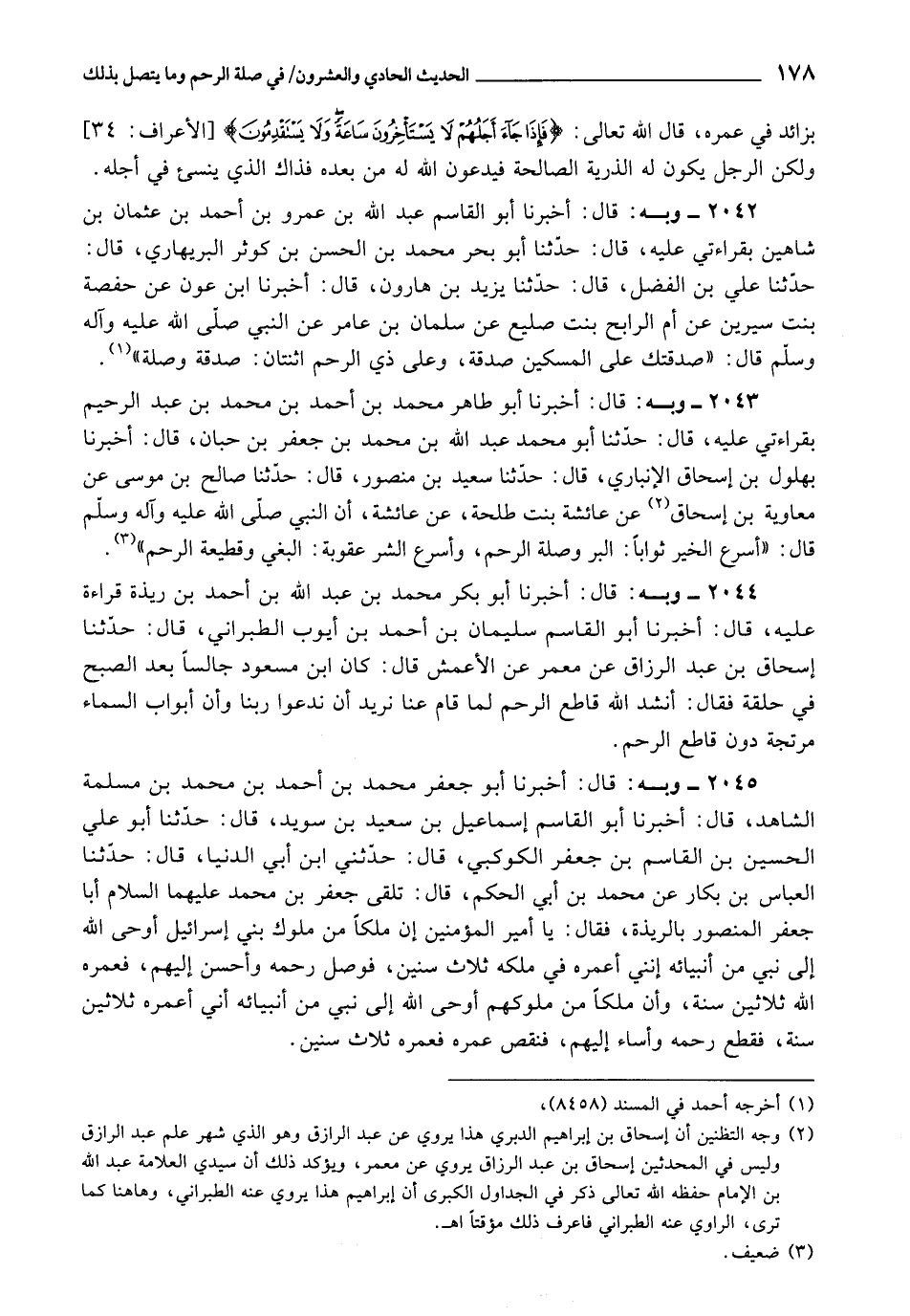 2044 - أَخْبَرَنَا أَبُو بَكْرٍ مُحَمَّدُ بْنُ عَبْدِ اللَّهِ بْنِ أَحْمَدَ بْنِ رَيْذَةَ , قِرَاءَةً عَلَيْهِ، قَالَ: أَخْبَرَنَا أَبُو الْقَاسِمِ سُلَيْمَانُ بْنُ أَحْمَدَ بْنِ أَيُّوبَ الطَّبَرَانِيُّ، قَالَ: حَدَّثَنَا إِسْحَاقُ بْنُ عَبْدِ الرَّزَّاقِ، عَنْ مَعْمَرٍ، عَنِ الْأَعْمَشِ قَالَ: كَانَ ابْنُ مَسْعُودٍ جَالِسًا بَعْدَ الصُّبْحِ فِي حَلَقَةٍ فقَالَ: «أنْشَدَ اللَّهُ قَاطِعَ الرَّحِمِ لَمَّا قَامَ عَنَّا نُرِيدُ أَنْ نَدْعُوَ رَبَّنَا وَأَنَّ أَبْوَابَ السَّمَاءِ مُرْتَجَةٌ دُونَ قَاطِعِ الرَّحِمِ»