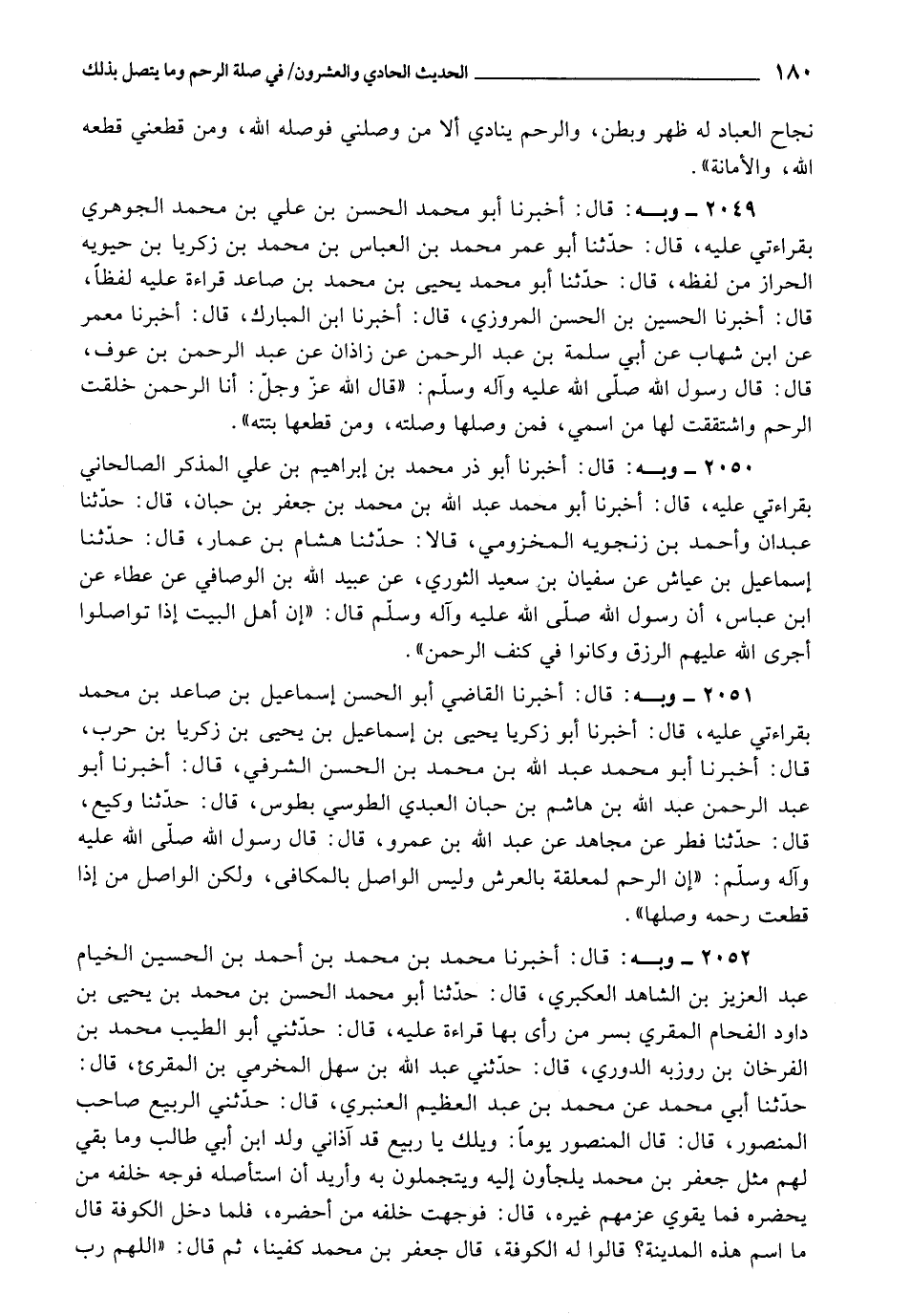 2051 - أَخْبَرَنَا الْقَاضِي أَبُو الْحَسَنِ إِسْمَاعِيلُ بْنُ صَاعِدِ بْنِ مُحَمَّدٍ , بِقِرَاءَتِي عَلَيْهِ، قَالَ: أَخْبَرَنَا أَبُو زَكَرِيَّا يَحْيَى بْنُ إِسْمَاعِيلَ بْنِ يَحْيَى بْنِ زَكَرِيَّا بْنِ حَرْبٍ، قَالَ: أَخْبَرَنَا أَبُو مُحَمَّدٍ عَبْدُ اللَّهِ بْنُ مُحَمَّدِ بْنِ الْحَسَنِ الشَّرَفِيُّ، قَالَ: أَخْبَرَنَا أَبُو عَبْدِ الرَّحْمَنِ عَبْدُ اللَّهِ بْنُ هَاشِمِ بْنِ حِبَّانَ الْعَبْدِيُّ الطُّوسِيُّ , بِطُوسَ، قَالَ: حَدَّثَنَا وَكِيعٌ، قَالَ: حَدَّثَنَا فِطْرٌ، عَنْ مُجَاهِدٍ، عَنْ عَبْدِ اللَّهِ بْنِ عَمْرٍو، قَالَ: قَالَ رَسُولُ اللَّهِ صَلَّى اللَّهُ عَلَيْهِ وَآلِهِ وَسَلَّمَ: «إِنَّ الرَّحِمَ لَمُعَلَّقَةٌ بِالْعَرْشِ , وَلَيْسَ الْوَاصِلُ بِالْمُكَافِئِ، وَلَكِنَّ الْوَاصِلَ مَنْ إِذَا قُطِعَتْ رَحِمُهُ وَصَلَهَا»