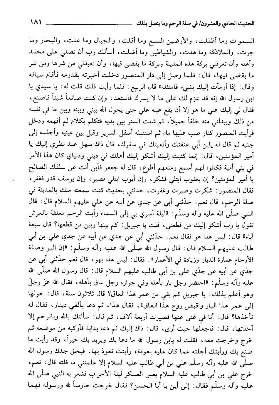 السَّمَوَاتِ , وَمَا أَظَلَّتْ، وَالْأَرَضِينَ السَّبْعِ وَمَا أَقَلَّتْ، وَالْجِبَالِ وَمَا عَلَتْ، وَالْبِحَارِ , وَمَا جَرَتْ، وَالْمَلَائِكَةِ مَا هَدَتْ، وَالشَّيَاطِينِ , وَمَا أَضَلَّتْ، أَسْأَلُكَ رَبِّ أَنْ تُصَلِّيَ عَلَى مُحَمَّدٍ وَأَهْلِهِ وَأَنْ تُعَرِّفَنِي بَرَكَةَ هَذِهِ الْمَدِينَةِ وَبَرَكَةَ مَا يُقْضَى فِيهَا، وَأَنْ تُعِيذَنِي مِنْ شَرِّهَا وَمِنْ شَرِّ مَا يُقْضَى فِيهَا، قَالَ: فَلَمَّا وَصَلَ إِلَى دَارِ الْمَنْصُورِ، دَخَلْتُ أَخْبَرْتُهُ بِقُدُومِهِ، فَأَقَامَ سَيَّافَهُ، وَقَالَ: إِذَا أَوْمَأْتُ إِلَيْكَ بِشَيْءٍ , فَامْتَثِلْهُ، قَالَ الرَّبِيعُ: فَلَمَّا رَأَيْتُ ذَلِكَ، قُلْتُ لَهُ: يَا سَيِّدِي، يَا ابْنَ رَسُولِ اللَّهِ، إِنَّهُ قَدْ عَزَمَ لَكَ عَلَى مَا لَا يَسُرُّكَ فَاسْتَعِدَّ، وَإِنْ كُنْتَ صَانِعًا شَيْئًا , فَاصْنَعْ، فَقَالَ لِي: إِلَيْكَ عَنِّي مَا هُو , إِلَّا أَنْ تَقَعَ عَيْنُهُ عَلِيَّ حَتَّى يَحُولَ اللَّهُ بَيْنِي وَبَيْنَهُ وَبَيْنَ مَا فِي نَفْسِهِ مِنْ ذَلِكَ، وَيُبْدِلَنِي مِنْهُ خُلُقًا جَمِيلًا، ثُمَّ شِلْتُ السِّتْرَ بَيْنَ يَدَيْهِ، فَتَكَلَّمَ بِكَلَامٍ لَمْ أَفْهَمْهُ , وَدَخَلَ، فَرَأَيْتُ الْمَنْصُورَ كَنَارٍ صُبَّ عَلَيْهِا مَاءٌ، ثُمَّ اسْتَقْبَلَهُ أَسْفَلَ السَّرِيرِ، وَقَبَّلَ بَيْنَ عَيْنَيْهِ، وَأَجْلَسَهُ إِلَى جَنْبِهِ، ثُمَّ قَالَ: يَا ابْنَ أَبِي عَنَّفْتُكَ وَأَتْعَبْتُكَ فِي سَفَرِكَ، قَالَ: ذَاكَ سَهْلٌ عِنْدَ نَظَرِي إِلَيْكَ يَا أَمِيرَ الْمُؤْمِنِينَ، قَالَ: إِنَّمَا كَتَبْتُ إِلَيْكَ أَشْكُو إِلَيْكَ أَهْلَكَ فِي دِينِي , وَدُنْيَايَ، كَانَ هَذَا الْأَمْرُ فِي بَنِي أُمَيَّةَ فَكَانُوا لَهُمْ أَسْمَعَ , وَمَنْعُهُمْ أَطْوَعَ، قَالَ لَهُ جَعْفَرٌ: فَأَيْنَ أَنْتَ عَنْ سَلَفِكَ الصَّالِحِ يَا أَمِيرَ الْمُؤْمِنِينَ؟ إِنَّ يَعْقُوبَ ابْتُلِيَ فَشَكَرَ، وَإِنَّ أَيُّوبَ ابْتُلِيَ , فَصَبَرَ، وَإِنَّ يُوسُفَ قَدِرَ , فَغَفَرَ، فَقَالَ الْمَنْصُورُ: , شَكَرْتُ وَصَبَرْتُ وَغَفَرْتُ، حَدَّثَنِي بِحَدِيثٍ كُنْتُ أَسْمَعُهُ مِنْكَ بِالْمَدِينَةِ فِي صِلَةِ الرَّحِمِ، قَالَ: نَعَمْ، حَدَّثَنِي أَبِي، عَنْ جَدِّي، عَنْ أَبِيهِ، عَنْ عَلِيٍّ عَلَيْهِمُ السَّلَامُ قَالَ: قَالَ النَّبِيُّ صَلَّى اللَّهُ عَلَيْهِ وَآلِهِ وَسَلَّمَ: " لَيْلَةَ أُسْرِيَ بِيَ إِلَى السَّمَاءِ رَأَيْتُ الرَّحِمَ مُعَلَّقَةً بِالْعَرْشِ تَقُولُ: يَا