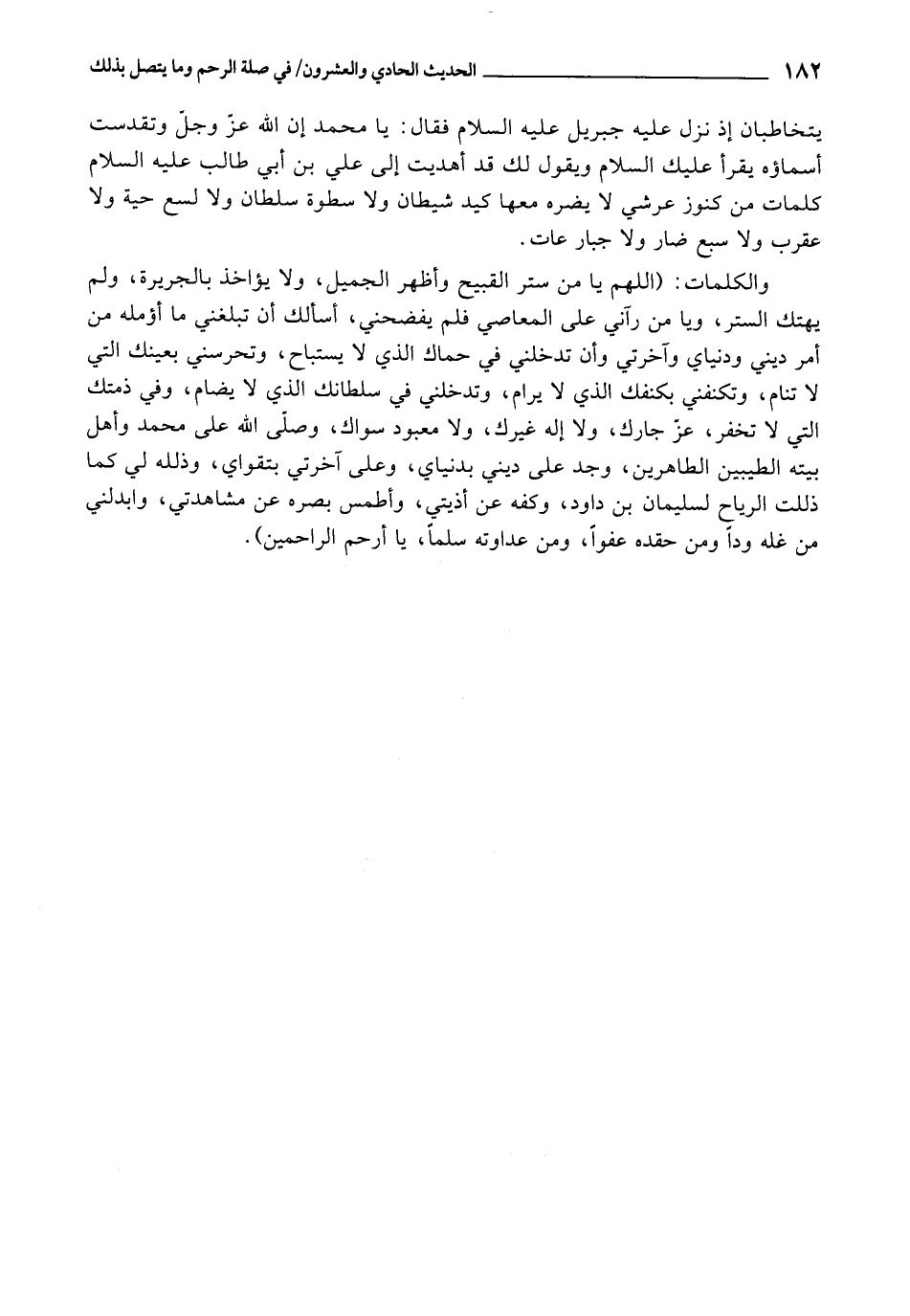 وَالْكَلِمَاتُ: اللَّهُمَّ يَا مَنْ سَتَرَ الْقَبِيحَ , وَأَظْهَرَ الْجَمِيلَ، وَلَا يُؤَاخَذُ بْالْجَرِيرَةِ، وَلَمْ يَهْتِكِ السَّتْرَ، وَيَا مَنْ رَآنِي عَلَى الْمَعَاصِي , فَلَمْ يَفْضَحْنِي، أَسْأَلُكَ أَنْ تُبَلِّغَنِي مَا آمُلُهُ مِنْ أَمْرِ دِينِي وَدُنْيَايَ وَآخِرَتِي , وَأَنْ تُدْخِلَنِي فِي حِمَاكَ الَّذِي لَا يُسْتَبَاحُ بِعَيْنَيْكَ الَّتِي لَا تَنَامُ، وَتَكْنُفَنِي بِكَنَفِكَ الَّذِي لَا يُرَامُ، وَتُدْخِلَنِي فِي سُلْطَانِكَ الَّذِي لَا يُضَامُ، وَفِي ذِمَّتِكَ الَّتِي لَا تُخْفَرُ، عَزَّ جَارُكَ، وَلَا إِلَهَ غَيْرُكَ، وَلَا مَعْبُودَ سِوَاكَ، وَصَلَّى اللَّهُ عَلَى مُحَمَّدٍ وَأَهْلِ بَيْتِهِ الطَّيِّبِينَ الطَّاهِرِينَ، وَجُدْ عَلَى دِينِي بِدُنْيَايَ، وَعَلَى آخِرَتِي بِتَقْوَايَ، وَذَلِّلْهُ لِي كَمَا ذَلَّلْتَ الرِّيَاحَ لِسُلَيْمَانَ بْنِ دَاوُدَ، وَكُفَّهُ عَنْ أَذِيَّتِي، وَاطْمِسْ بَصَرَهُ عَنْ مُشَاهَدَتِي، وَأَبْدِلْنِي مِنْ غِلِّهِ وُدًّا , وَمِنْ حِقْدِهِ عَفْوًا , وَمِنْ عَدَوَاتِهِ سِلْمًا، يَا أَرْحَمَ الرَّاحِمِينَ