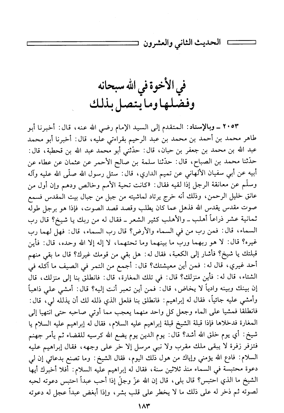 عَلَيْهِ السَّلَامُ: يَا شَيْخُ أَيَّ يَوْمٍ خَلَقَ اللَّهُ أَشَدَّ؟ قَالَ: يَوْمَ الدِّينِ يَوْمَ يَضَعُ اللَّهُ كُرْسِيَّهُ لِلْقَضَاءِ، ثُمَّ يَأْمُرُ جَهَنَّمَ فَتَزْفِرُ زَفْرَةً لَا يَبْقَى مَلَكٌ مُقَرَّبٌ وَلَا نَبِيٌّ مُرْسَلٌ إِلَّا خَرَّ عَلَى وَجْهِهِ، فَقَالَ إِبْرَاهِيمُ عَلَيْهِ السَّلَامُ: فَادْعُ اللَّهَ يُؤَمِّنِّي وَإِيَّاكَ مِنْ هَوْلِ ذَلِكَ الْيَوْمِ، فَقَالَ الشَّيْخُ: وَمَا تَصْنَعُ بِدُعَائِي إِنَّ لِي دَعْوَةً مُحْتَبِسَةً فِي السَّمَاءِ مُنْذُ ثَلَاثِينَ سَنَةً، فَقَالَ إِبْرَاهِيمُ عَلَيْهِ السَّلَامُ: أَفَلَا أُخْبِرُكَ أَيُّهَا الشَّيْخُ مَا الَّذِي احْتَبَسَ؟ قَالَ: بَلَى، إِنَّ اللَّهَ عَزَّ وَجَلَّ إِذَا أَحَبَّ عَبْدًا احْتَبَسَ دَعْوَتَهُ لِحُبِّهِ لِصَوْتِهِ، ثُمَّ ذَخَرَ لَهُ عَلَى ذَلِكَ مَا لَا يَخْطُرُ عَلَى قَلْبِ بَشَرٍ، وَإِذَا بَغَضَ عَبْدًا عَجَّلَ لَهُ دَعْوَتَهُ