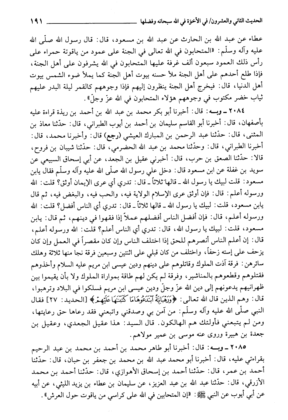 2084 - أَخْبَرَنَا أَبُو بَكْرٍ مُحَمَّدُ بْنُ عَبْدِ اللَّهِ بْنِ أَحْمَدَ بْنِ رَيْذَةَ , قِرَاءَةً عَلَيْهِ , بِأَصْفَهَانَ، قَالَ: أَخْبَرَنَا أَبُو الْقَاسِمِ بْنُ أَحْمَدَ بْنِ أَيُّوبَ الطَّبَرَانِيُّ، قَالَ: حَدَّثَنَا مُعَاذٌ الْمُثَنَّى، قَالَ: حَدَّثَنَا عَبْدُ الرَّحْمَنِ بْنُ الْمُبَارَكِ الْعَيْشِيُّ رَجَعَ قَالَ: وَأَخْبَرَنَا مُحَمَّدٌ، قَالَ: أَخْبَرَنَا الطَّبَرَانِيُّ، قَالَ: وَحَدَّثَنَا مُحَمَّدُ بْنُ عَبْدِ اللَّهِ الْحَضْرَمِيِّ، قَالَ: حَدَّثَنَا شَيْبَانُ بْنُ فَرُّوخَ، قَالَا: حَدَّثَنَا الصَّعْقُ بْنُ حَرْبٍ، قَالَ: أَخْبَرَنِي عُقَيْلُ بْنُ الْجَعْدِ، عَنْ أَبِي إِسْحَاقَ السَّبِيعِيِّ، عَنْ سُوَيْدِ بْنِ غَفْلَةَ، عَنِ ابْنِ مَسْعُودٍ قَالَ: دَخَلَ عَلِيَّ رَسُولُ اللَّهِ صَلَّى اللَّهُ عَلَيْهِ وَآلِهِ وَسَلَّمَ، فَقَالَ: يَابْنَ مَسْعُودٍ، قُلْتُ: لَبَّيْكَ يَا رَسُولَ اللَّهِ - قَالَهَا ثَلَاثًا - قَالَ: تَدْرِي أَيُّ عُرَى الْإِيمَانِ أَوْثَقُ؟ قُلْتُ: اللَّهُ وَرَسُولُهُ أَعْلَمُ: قَالَ: " فَإِنَّ أَوْثَقَ عُرَى الْإِسْلَامِ: الْوَلَايَةُ فِيهِ، وَالْحُبُّ فِيهِ، وَالْبُغْضُ فِيهِ " ثُمَّ قَالَ: يَابْنَ مَسْعُودٍ، قُلْتُ: لَبَّيْكَ يَا رَسُولَ اللَّهِ - قَالَهَا ثَلَاثًا - قَالَ: تَدْرِي أَيُّ النَّاسِ أَفْضَلُ؟ قُلْتُ: اللَّهُ وَرَسُولُهُ أَعْلَمُ، قَالَ: «فَإِنَّ أَفْضَلَهُمْ عَمَلًا إِذَا فَقِهُوا فِي دِينِهِمْ» ثُمَّ قَالَ: يَا ابْنَ مَسْعُودٍ، قُلْتُ: لَبَّيْكَ يَا رَسُولَ اللَّهِ، قَالَ: تَدْرِي أَيُّ النَّاسِ أَعْلَمُ؟ ، قُلْتُ: اللَّهُ وَرَسُولُهُ أَعْلَمُ، قَالَ: " إِنَّ أَعْلَمَ النَّاسِ أَنْصَرُهُمْ لِلْحَقِّ إِذَا اخْتَلَفَ النَّاسُ، وَإِنْ كَانَ مُقَصِّرًا فِي الْعَمَلِ، وَإِنْ كَانَ يَزْحَفُ عَلَى اسْتِهِ زَحْفًا، وَاخْتَلَفَ مَنْ كَانَ قَبْلِي عَلَى اثْنَيْنِ وَسَبْعِينَ فِرْقَةً، نَجَا مِنْهَا ثَلَاثَةٌ وَهَلَكَ سَائِرُهُنَّ: فِرْقَةٌ آذَتِ الْمُلُوكَ وَقَاتَلُوهُمْ عَلَى دِينِهِمْ وَدِينِ عِيسَى ابْنِ مَرْيَمَ عَلَيْهِ السَّلَامُ، وَأَخَذُوهُمْ فَقَتَلُوهُمْ وَقَطَّعُوهُمْ بِالْمَنَاشِيرِ، وَفِرْقَةٌ لَمْ يَكُنْ لَهَا طَاقَةٌ بِمُوَارَاةِ الْمُلُوكِ، وَلَا بِأَنْ يُقِيمُوا بَيْنَ ظَهْرَانِيهِمْ يَدْعُونَهُمْ إِلَى دِينِ اللَّهِ عَزَّ وَجَلَّ وَدِينِ عِيسَى ابْنِ مَرْيَمَ , فَسَلَكُوا فِي الْبِلَادِ , وَتَرَهَّبُوا، قَالَ: وَهُمُ الَّذِينَ قَالَ اللَّهُ تَعَالَى: {وَرَهْبَانِيَّةً ابْتَدَعُوهَا مَا كَتَبْنَاهَا عَلَيْهِمْ} [الحديد: 27] ، فَقَالَ النَّبِيُّ صَلَّى اللَّهُ عَلَيْهِ وَآلِهِ وَسَلَّمَ: مَنْ آمَنَ بِي وَصَدَّقَنِي، وَاتَّبَعَنِي , فَقَدْ رَعَاهَا حَقَّ رِعَايَتِهَا، وَمَنْ لَمْ يَتَّبِعْنِي فَأُولَئِكَ هُمُ الْهَالِكُونَ ".