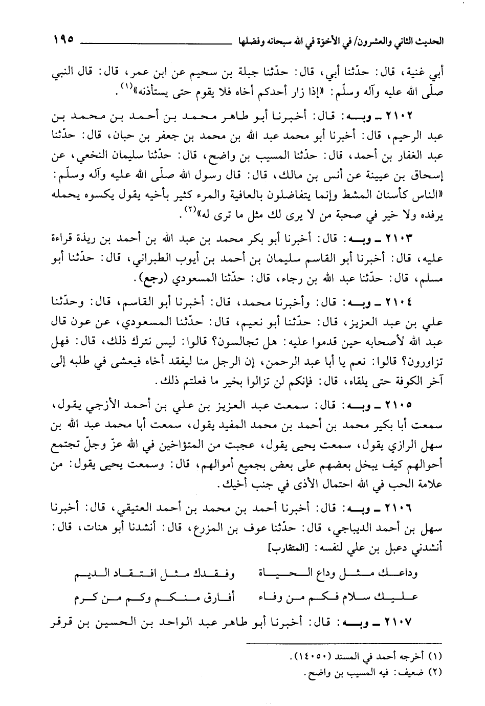 2105 - سَمِعْتُ عَبْدَ الْعَزِيزِ بْنَ عَلِيِّ بْنِ أَحْمَدَ الْأَزَجِيُّ , يَقُولُ، سَمِعْتُ أَبَا بَكِيرٍ مُحَمَّدَ بْنَ أَحْمَدَ بْنِ أَحْمَدَ بْنِ مُحَمَّدٍ الْمُفِيدَ , يَقُولُ، سَمِعْتُ أَبَا مُحَمَّدٍ عَبْدَ اللَّهِ بْنَ سَهْلٍ الرَّازِيَّ يَقُولُ، سَمِعْتُ يَحْيَى يَقُولُ، عَجِبْتُ مِنَ الْمُتَآخِينَ فِي اللَّهِ عَزَّ وَجَلَّ تَجْتَمِعُ أَحْوَالُهُمْ كَيْفَ يَبْخَلُ بَعْضُهُمْ عَلَى بَعْضٍ بِجَمِيعِ أَمْوَالِهِمْ؟ قَالَ: وَسَمِعْتُ يَحْيَى يَقُولُ: مِنْ عَلَامَةِ الْحُبِّ فِي اللَّهِ احْتِمَالُ الْأَذَى فِي جَنْبِ أَخِيكَ.