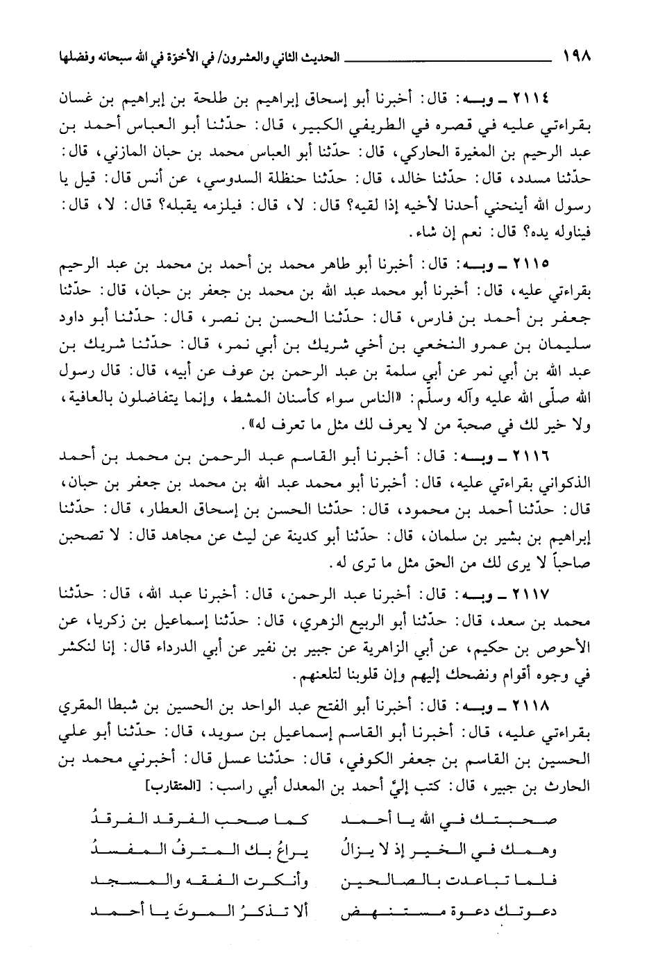 2114 - أَخْبَرَنَا أَبُو إِسْحَاقَ إِبْرَاهِيمُ بْنُ طَلْحَةَ بْنِ إِبْرَاهِيمَ بْنِ غَسَّانَ بِقِرَاءَتِي عَلَيْهِ فِي قَصْرِهِ فِي الطَّرِيفِيِّ الْكَبِيرِ، قَالَ: حَدَّثَنَا أَبُو الْعَبَّاسِ أَحْمَدُ بْنُ عَبْدِ الرَّحِيمِ بْنِ الْمُغِيرَةِ الْحَارِكِيُّ، قَالَ: حَدَّثَنَا أَبُو الْعَبَّاسِ مُحَمَّدُ بْنُ حِبَّانَ الْمَازِنِيُّ , قَالَ: حَدَّثَنَا مُسَدَّدٌ، قَالَ: حَدَّثَنَا خَالِدٌ، قَالَ حَدَّثَنَا حَنْظَلَةُ السَّدُوسِيُّ، عَنْ أَنَسٍ , قَالَ: قِيلَ: " يَا رَسُولَ اللَّهِ أَيْنَحَنِي أَحَدُنَا لِأَخِيهِ إِذَا لَقِيَهُ؟ قَالَ: لَا، قَالَ: فَيَلْزَمُهُ , يُقَبِّلُهُ؟ قَالَ: لَا، قَالَ: فَيُنَاوِلُهُ يَدَهُ؟ قَالَ: نَعَمْ إِنْ شَاءَ "