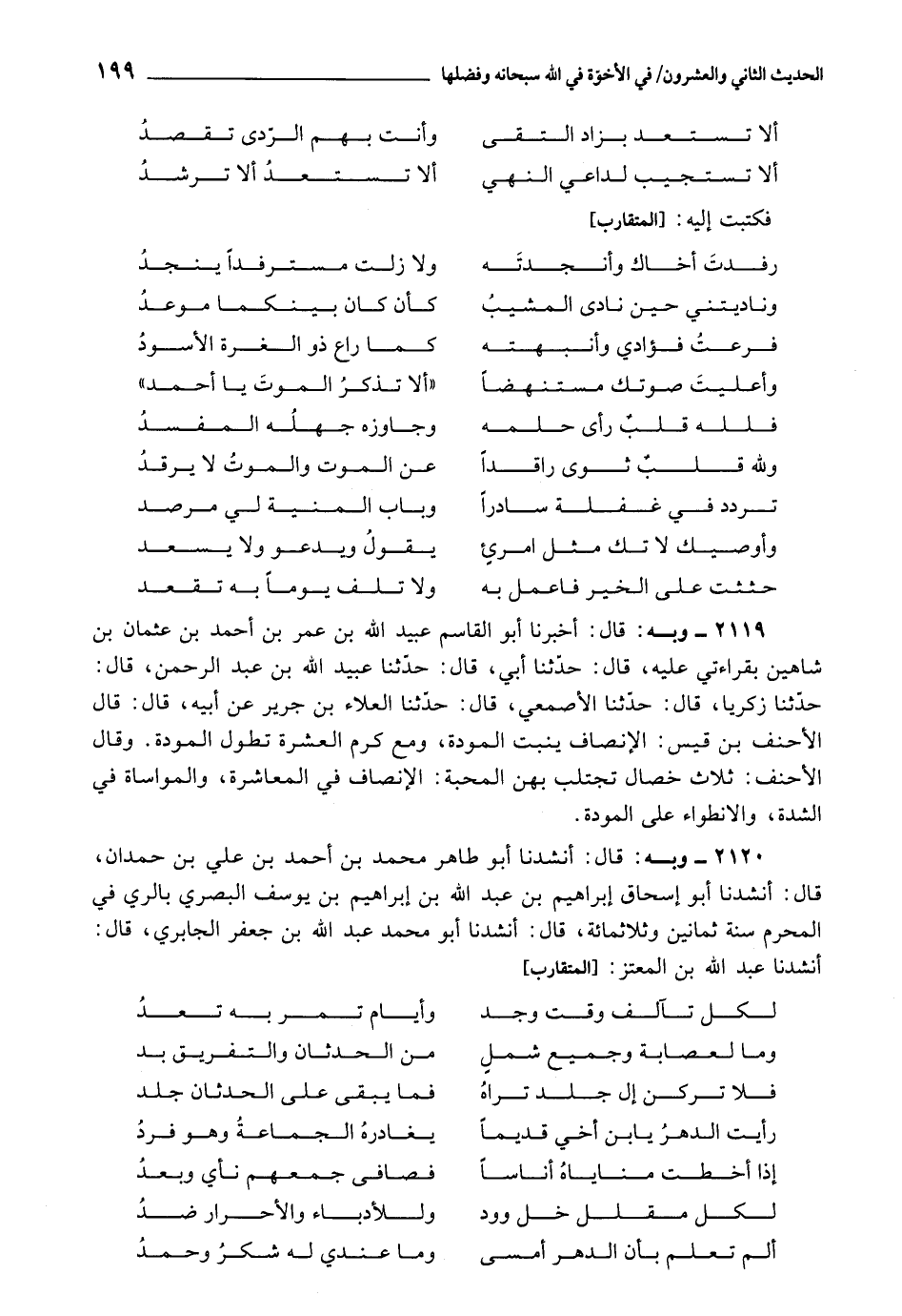 أَنْشَدَنَا أَبُو طَاهِرٍ مُحَمَّدُ بْنُ أَحْمَدَ بْنِ عَلِيِّ بْنِ حِمْدَانَ، قَالَ: أَنْشَدَنَا أَبُو إِسْحَاقَ إِبْرَاهِيمُ بْنُ عَبْدِ اللَّهِ بْنِ يُوسُفَ الْبَصْرِيُّ , بِالرَّيِّ فِي الْمُحَرَّمِ سَنَةَ ثَمَانِينَ وَثَلاثِ مِائَةٍ، قَالَ: أَنْشَدَنَا أَبُو مُحَمَّدِ بْنُ عَبْدِ اللَّهِ بْنِ جَعْفَرٍ الْجَابِرِيُّ، قَالَ: أَنْشَدَنَا عَبْدُ اللَّهُ بْنُ الْمُعْتَزِّ: