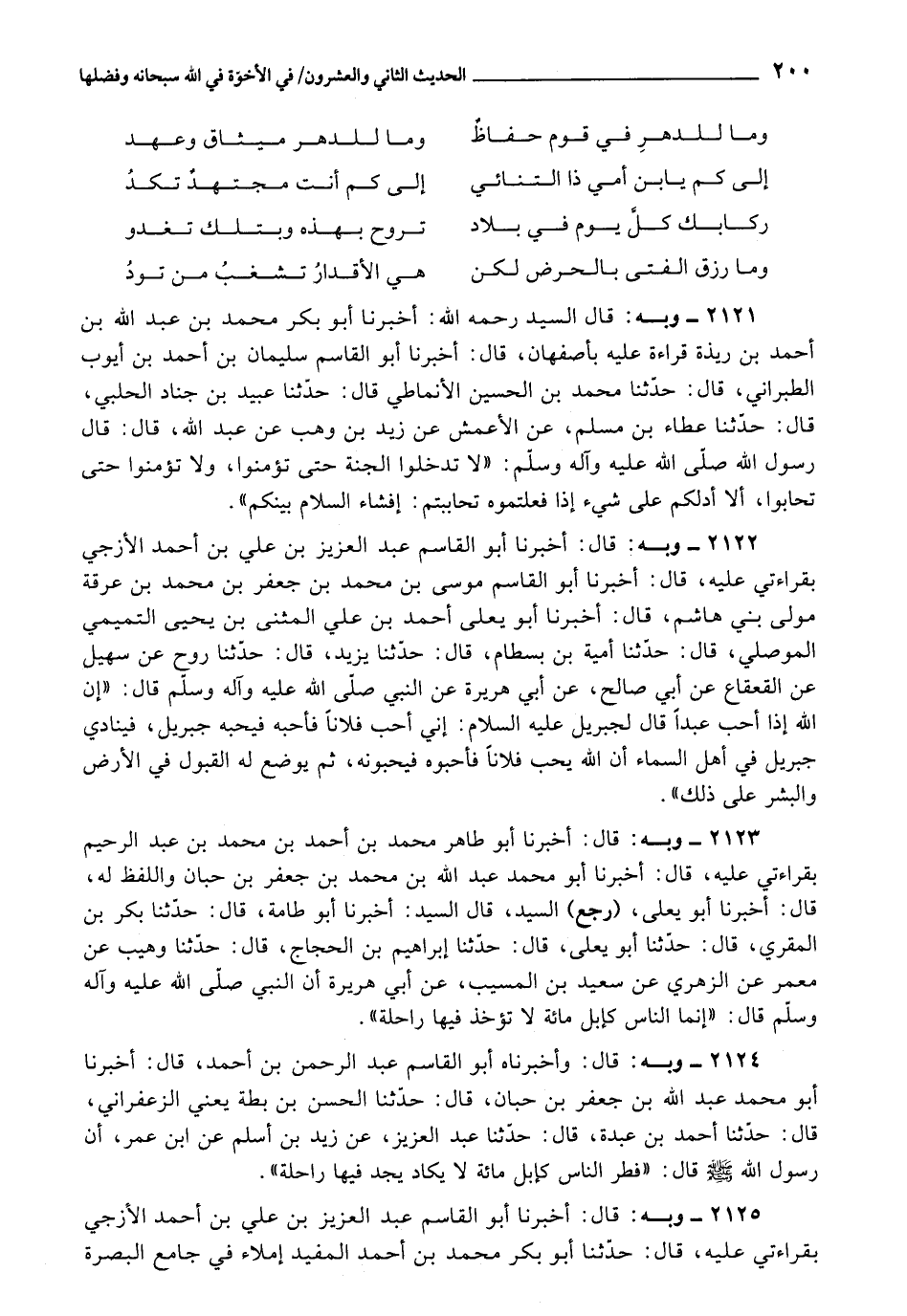 2121 - أَخْبَرَنَا أَبُو الْقَاسِمِ سُلَيْمَانُ بْنُ أَحْمَدَ بْنِ أَيُّوبَ الطَّبَرَانِيُّ، قَالَ: حَدَّثَنَا مُحَمَّدُ بْنُ الْحُسَيْنِ الْأَنْمَاطِيُّ، قَالَ: حَدَّثَنَا عُبَيْدُ بْنُ جُنَادٍ الْحَلَبِيُّ، قَالَ: حَدَّثَنَا عَطَاءُ بْنُ مُسْلِمٍ، عَنِ الْأَعْمَشِ، عَنْ زَيْدِ بْنِ وَهْبٍ، عَنْ عَبْدِ اللَّهِ، قَالَ: قَالَ رَسُولُ اللَّهِ صَلَّى اللَّهُ عَلَيْهِ وَآلِهِ وَسَلَّمَ: " لَا تَدْخُلُوا الْجَنَّةَ , حَتَّى تُؤْمِنُوا، وَلَا تُؤْمِنُوا , حَتَّى تَحَابُّوا، أَلَا أَدُلُّكُمْ عَلَى شَيْءٍ إِذَا فَعَلْتُمُوهُ , تَحَابَبْتُمْ: إِفْشَاءُ السَّلَامِ بَيْنَكُمْ "