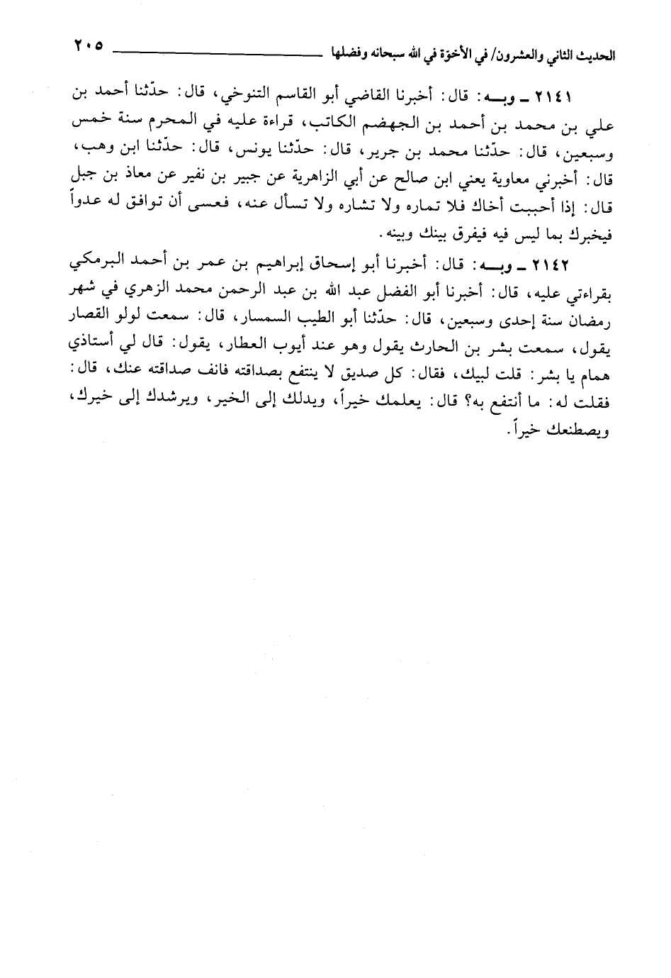 2142 - أَخْبَرَنَا أَبُو إِسْحَاقَ إِبْرَاهِيمُ بْنُ عُمَرَ بْنِ أَحْمَدَ الْبَرْمَكِيُّ , بِقِرَاءَتِي عَلَيْهِ، قَالَ: أَخْبَرَنَا أَبُو الْفَضْلِ عَبْدُ اللَّهِ بْنُ عَبْدِ الرَّحْمَنِ مُحَمَّدٌ الزُّهْرِيُّ , فِي شَهْرِ رَمَضَانَ سَنَةَ إِحْدَى وَسَبْعِينَ، قَالَ: حَدَّثَنَا أَبُو الطَّيِّبِ السِّمْسَارُ، قَالَ: سَمِعْتُ لُؤْلُؤًا الْقَصَّارَ , يَقُولُ، سَمِعْتُ بِشْرَ بْنَ الْحَارِثِ يَقُولُ: وَهُوَ عِنْدَ أَيُّوبَ الْعَطَّارِ، يَقُولُ: قَالَ لِي أُسْتَاذِي هَمَّامٌ: يَا بِشْرُ قُلْتُ: لَبَّيْكَ، فَقَالَ: كُلُّ صَدِيقٍ لَا يَنْتَفِعُ بِصَدَاقَتِهِ , فَانْفِ صَدَاقَتَهُ عَنْكَ، قَالَ: فَقُلْتُ لَهُ: مَا أَنْتَفِعُ بِهِ؟ قَالَ: يُعَلِّمُكَ خَيْرًا، وَيَدُلُّكَ إِلَى الْخَيْرِ، وَيُرْشِدُكَ إِلَى خَيْرِكَ، وَيَصْطَنِعُكَ خَيْرًا.