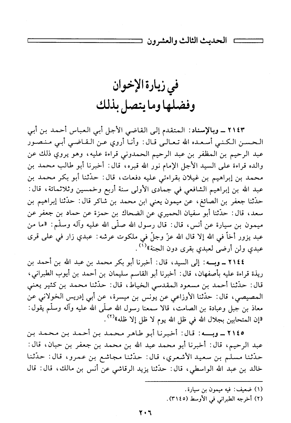 2143 - أَخْبَرَنَا أَبُو طَالِبٍ مُحَمَّدُ بْنُ مُحَمَّدِ بْنِ إِبْرَاهِيمَ بْنِ غَيْلَانَ , بِقِرَاءَتِي عَلَيْهِ دُفْعَاتٍ، قَالَ: حَدَّثَنَا أَبُو بَكْرٍ مُحَمَّدُ بْنُ عَبْدِ اللَّهِ بْنِ إِبْرَاهِيمَ الشَّافِعِيُّ , فِي جُمَادَى الْأُولَى سَنَةَ أَرْبَعٍ وَخَمْسِينَ وَثَلاثِ مِائَةٍ، قَالَ: حَدَّثَنَا جَعْفَرُ بْنُ الصَّائِغِ، عَنْ مَيْمُونٍ يَعْنِي ابْنَ مُحَمَّدِ بْنِ شَاكِرٍ قَالَ: حَدَّثَنَا إِبْرَاهِيمُ بْنُ سَعْدٍ، قَالَ: حَدَّثَنَا أَبُو سُفْيَانَ الْحِمْيَرِيُّ، عَنِ الضَّحَّاكِ بْنِ حَمْزَةَ، عَنْ حَمَّادِ بْنِ جَعْفَرٍ، عَنْ مَيْمُونِ بْنِ سَيَّارَةٍ، عَنْ أَنَسٍ، قَالَ: قَالَ رَسُولُ اللَّهِ صَلَّى اللَّهُ عَلَيْهِ وَآلِهِ وَسَلَّمَ: " مَا مِنْ عَبْدٍ يَزُورُ أَخًا فِي اللَّهِ , إِلَّا قَالَ اللَّهُ عَزَّ وَجَلَّ فِي مَلَكُوتِ عَرْشِهِ: عَبْدِي زَارَ فِيَّ عَلَى قِرَى عَبْدِي , وَلَنْ أَرْضَى لِعَبْدِي بِقِرَى دُونَ الْجَنَّةِ "