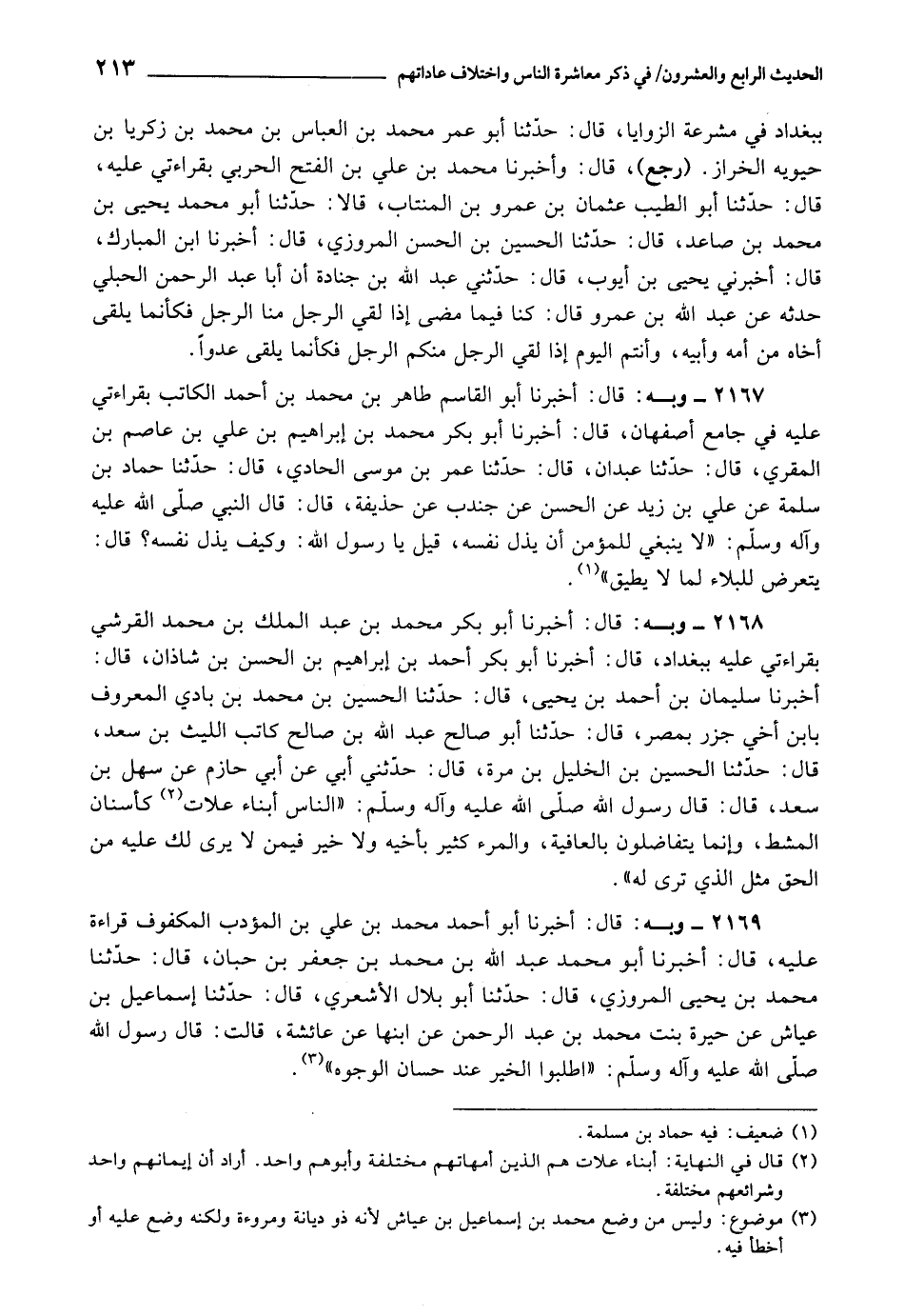 2168 - أَخْبَرَنَا أَبُو بَكْرٍ مُحَمَّدُ بْنُ عَبْدِ الْمَلِكِ بْنِ مُحَمَّدٍ الْقُرَشِيُّ , بِقِرَاءَتِي عَلَيْهِ بِبَغْدَادَ، قَالَ: أَخْبَرَنَا أَبُو بَكْرٍ أَحْمَدُ بْنُ إِبْرَاهِيمَ بْنِ الْحَسَنِ بْنِ شَاذَانَ، قَالَ: أَخْبَرَنَا سُلَيْمَانُ بْنُ أَحْمَدَ بْنِ يَحْيَى، قَالَ: حَدَّثَنَا الْحُسَيْنُ بْنُ مُحَمَّدِ بْنِ بَادِيٍّ الْمَعْرُوفُ بِابْنِ أَخِي جَزَرٍ , بِمِصْرَ، قَالَ: حَدَّثَنَا أَبُو صَالِحٍ عَبْدُ اللَّهِ بْنُ صَالِحٍ كَاتِبُ اللَّيْثِ بْنِ سَعْدٍ , قَالَ: حَدَّثَنَا الْحُسَيْنُ بْنُ الْخَلِيلِ بْنِ مُرَّةَ، قَالَ: حَدَّثَنِي أَبِي، عَنْ أَبِي حَازِمٍ، عَنْ سَهْلِ بْنِ سَعْدٍ، قَالَ: قَالَ رَسُولُ اللَّهِ صَلَّى اللَّهُ عَلَيْهِ وَآلِهِ وَسَلَّمَ: «النَّاسُ أبْنَاءُ عَلَّاتٍ كَأَسْنَانِ الْمُشْطِ، وَإِنَّمَا يَتَفَاضَلُونَ بِالْعَافِيَةِ، وَالْمَرْءُ كَثِيرٌ بِأَخِيهِ، وَلَا خَيْرَ فِيمَنْ لَا يَرَى لَكَ عَلَيْهِ مِنَ الْحَقِّ مِثْلَ الَّذِي تَرَى لَهُ»