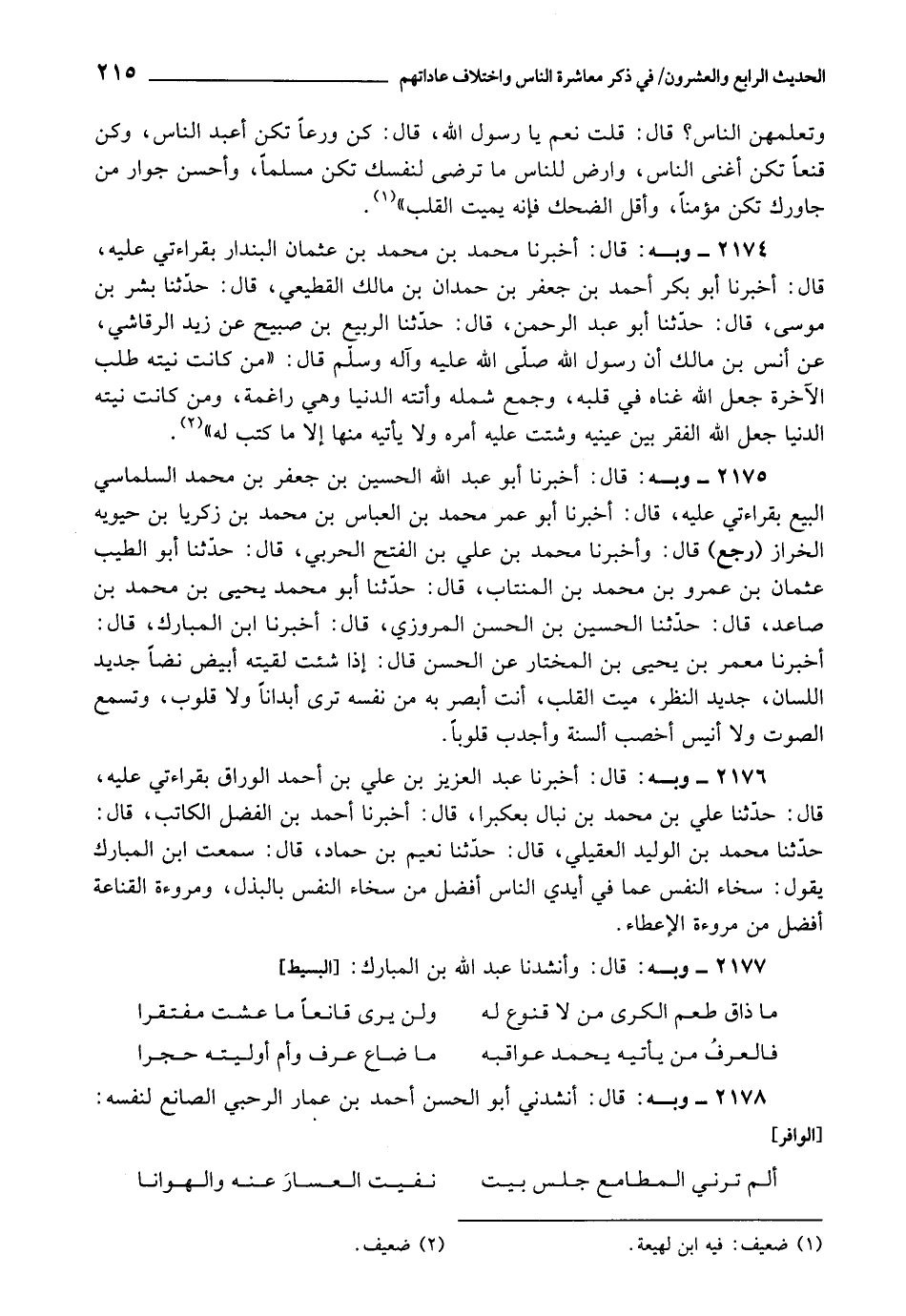 2176 - أَخْبَرَنَا عَبْدُ الْعَزِيزِ بْنُ عَلِيِّ بْنِ أَحْمَدَ الْوَرَّاقُ بِقِرَاءَتِي عَلَيْهِ، قَالَ: حَدَّثَنَا عَلِيُّ بْنُ مُحَمَّدِ بْنِ نِبَالٍ بِعُكْبَرَا، قَالَ: أَخْبَرَنَا أَحْمَدُ بْنُ الْفَضْلِ الْكَاتِبُ، قَالَ: حَدَّثَنَا مُحَمَّدُ بْنُ الْوَلِيدِ الْعُقَيْلِيُّ، قَالَ: حَدَّثَنَا نُعَيْمُ بْنُ حَمَّادٍ، قَالَ: سَمِعْتُ ابْنَ الْمُبَارَكِ يَقُولُ: سَخَاءُ النَّفْسِ عَمَّا فِي أَيْدِي النَّاسِ أَفْضَلُ مِنْ سَخَاءِ النَّفْسِ بِالْبَذْلِ، وَمُرُوءَةُ الْقَنَاعَةِ أَفْضَلُ مِنْ مُرُوءَةِ الْإِعْطَاءِ.