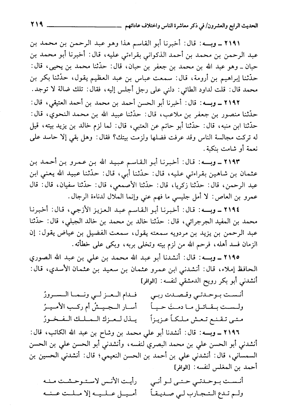2195 - أَنْشَدَنَا أَبُو عَبْدِ اللَّهِ مُحَمَّدُ بْنُ عَلِيِّ بْنِ عَبْدِ اللَّهِ الصُّورِيُّ الْحَافِظُ , إِمْلَاءً، قَالَ: أَنْشَدَنِي ابْنُ عَمْرٍو عُثْمَانُ بْنُ سَعِيدِ بْنِ عُثْمَانَ الْأَسَدِيُّ، قَالَ: أَنْشَدَنِي أَبُو بَكْرٍ رُوَيْحٌ الدِّمَشْقِيُّ , لِنَفْسِهِ: أَنِسْتُ بِوَحْدَتِي , وَقَصَدْتُ رَبِّي , فَدَامَ الْعِزُّ لِي , وَنَمَا السُّرُورُ