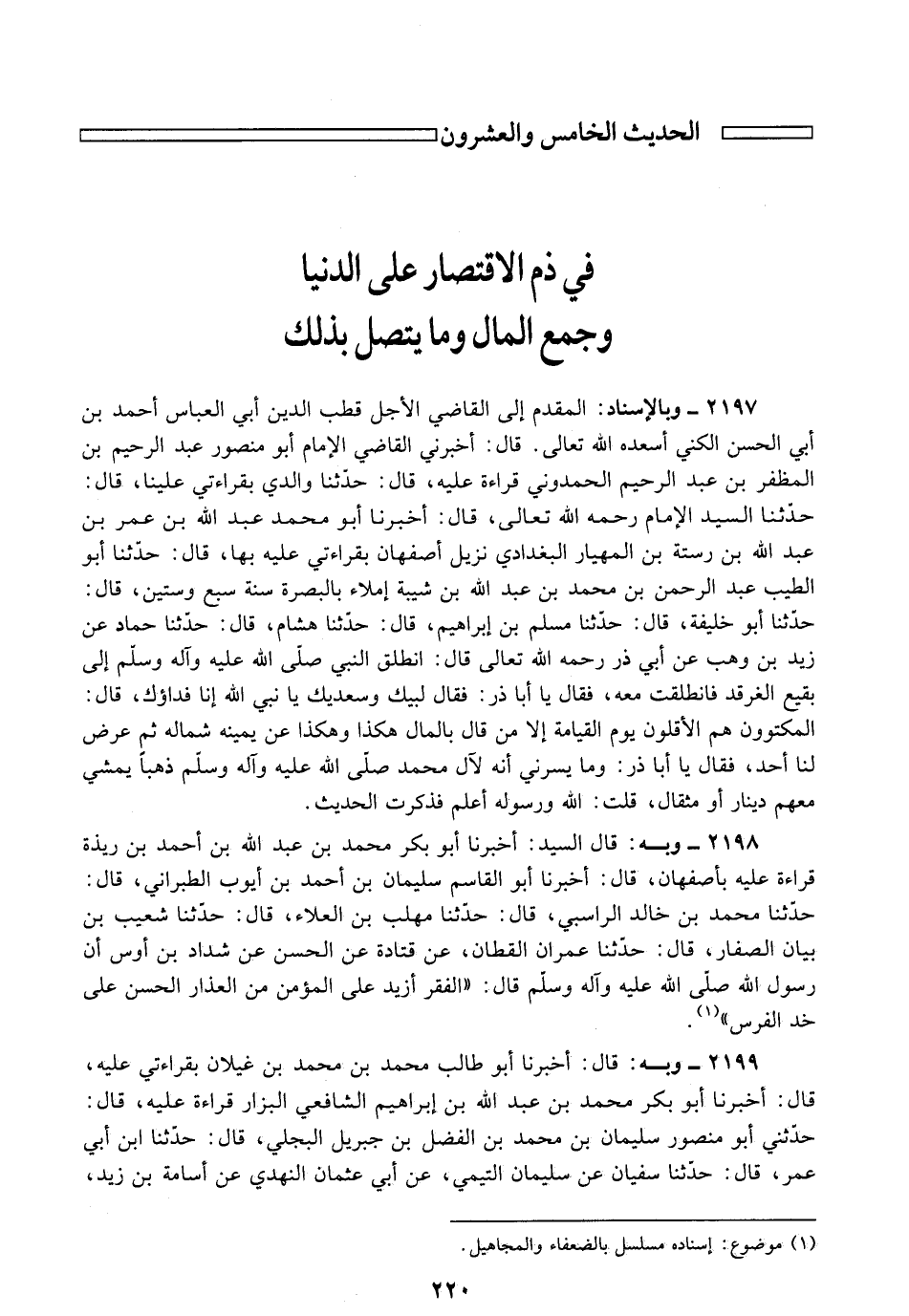 2197 - أَخْبَرَنَا أَبُو مُحَمَّدٍ عَبْدُ اللَّهِ بْنُ عُمَرَ بْنِ عَبْدِ اللَّهِ بْنِ رَسْتَةَ بْنِ الْمِهْيَارِ الْبَغْدَادِيُّ نَزِيلُ أَصْفَهَانَ , بِقِرَاءَتِي عَلَيْهِ بِهَا، قَالَ: حَدَّثَنَا أَبُو الطَّيِّبِ عَبْدُ الرَّحْمَنِ بْنُ مُحَمَّدِ بْنِ عَبْدِ اللَّهِ بْنِ شَيْبَةَ، إِمْلَاءً، بِالْبَصْرَةِ سَنَةَ سَبْعٍ وَسِتِّينَ، قَالَ: حَدَّثَنَا أَبُو خَلِيفَةَ، قَالَ: حَدَّثَنَا مُسْلِمُ بْنُ إِبْرَاهِيمَ، قَالَ: حَدَّثَنَا هِشَامٌ، قَالَ: حَدَّثَنَا حَمَّادٌ، عَنْ زَيْدِ بْنِ وَهْبٍ، عَنْ أَبِي ذَرٍّ رَحِمَهُ اللَّهُ تَعَالَى , قَالَ: انْطَلَقَ النَّبِيُّ صَلَّى اللَّهُ عَلَيْهِ وَآلِهِ وَسَلَّمَ إِلَى بَقِيعِ الْغَرْقَدِ، فَانْطَلَقْتُ مَعَهُ، فَقَالَ: يَا أَبَا ذَرٍّ فَقَالَ: لَبَّيْكَ وَسَعْدَيْكَ يَا نَبِيَّ اللَّهِ , إِنَّا فِدَاؤُكَ، قَالَ: " الْمُكْتَوُونَ هُمُ الْأَقَلُّونَ يَوْمَ الْقِيَامَةِ , إِلَّا مَنْ قَالَ بِالْمَالِ هَكَذَا وَهَكَذَا عَنْ يَمِينِهِ شِمَالِهِ، ثُمَّ عَرَضَ لَنَا أَحَدٌ، فَقَالَ: يَا أَبَا ذَرٍّ: وَمَا يَسُرُّنِي أَنَّهُ لِآلِ مُحَمَّدٍ صَلَّى اللَّهُ عَلَيْهِ وَآلِهِ وَسَلَّمَ ذَهَبًا يَمْشِي مَعَهُمْ دِينَارٌ أَوْ مِثْقَالٌ، قُلْتُ: اللَّهُ وَرَسُولُهُ أَعْلَمُ " , فَذَكَرْتُ الْحَدِيثَ