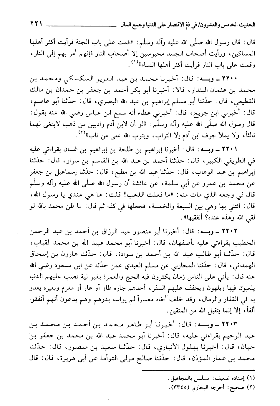 2200 - أَخْبَرَنَا مُحَمَّدُ بْنُ عَبْدُ الْعَزِيزِ السَّكْسَكِيُّ , وَمُحَمَّدُ بْنُ مُحَمَّدِ بْنِ عُثْمَانَ الْبُنْدَارُ، قَالَا: أَخْبَرَنَا أَبُو بَكْرٍ أَحْمَدُ بْنُ جَعْفَرِ بْنِ حِمْدَانَ بْنِ مَالِكٍ الْقَطِيعِيُّ، قَالَ: حَدَّثَنَا أَبُو مُسْلِمٍ إِبْرَاهِيمُ بْنُ عَبْدِ اللَّهِ الْبَصْرِيُّ، قَالَ: حَدَّثَنَا أَبُو عَاصِمٍ، قَالَ: أَخْبَرَنِي ابْنُ جُرَيْحٍ، قَالَ: أَخْبَرَنِي عَطَاءٌ , أَنَّهُ سَمِعَ ابْنَ عَبَّاسٍ رَضِيَ اللَّهُ عَنْهُ , يَقُولُ: قَالَ رَسُولُ اللَّهِ صَلَّى اللَّهُ عَلَيْهِ وَآلِهِ وَسَلَّمَ: «لَوْ أَنَّ لِابْنِ آدَمَ وَادِيَيْنِ مِنْ ذَهَبٍ , لَابْتَغَى لَهُمَا ثَالِثًا، وَلَا يَمْلَأُ جَوْفَ ابْنِ آدَمَ , إِلَّا التُّرَابُ، وَيَتُوبُ اللَّهُ عَلَى مَنْ تَابَ»