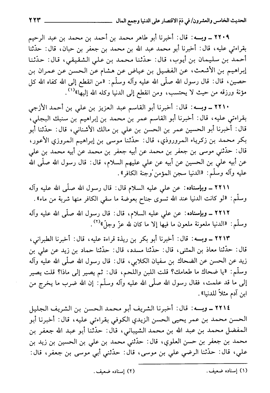 2210 - أَخْبَرَنَا أَبُو الْقَاسِمِ عَبْدُ الْعَزِيزِ بْنُ عَلِيِّ بْنِ أَحْمَدَ الْأَزَجِيُّ , بِقِرَاءَتِي عَلَيْهِ، قَالَ: أَخْبَرَنَا أَبُو الْقَاسِمِ عُمَرُ بْنُ مُحَمَّدِ بْنِ إِبْرَاهِيمَ بْنِ سُنْبُكٍ الْبَجَلِيُّ، قَالَ: أَخْبَرَنَا أَبُو الْحُسَيْنِ عُمَرُ بْنُ الْحَسَنِ بْنِ عَلِيِّ بْنِ مَالِكٍ الْأُشْنَانِيُّ، قَالَ: حَدَّثَنَا أَبُو بَكْرٍ مُحَمَّدُ بْنُ زَكَرِيَّاءَ الْمَرْوَرُّوذِيُّ، قَالَ: حَدَّثَنَا مُوسَى بْنُ إِبْرَاهِيمَ الْمَرْوَزِيُّ الْأَعْوَرُ، قَالَ: حَدَّثَنِي مُوسَى بْنُ جَعْفَرِ بْنِ مُحَمَّدٍ، عَنْ أَبِيهِ جَعْفَرِ بْنِ مُحَمَّدٍ، عَنْ أَبِيهِ مُحَمَّدِ بْنِ عَلِيٍّ، عَنْ أَبِيهِ عَلِيِّ بْنِ الْحُسَيْنِ، عَنْ أَبِيهِ، عَنْ عَلِيٍّ عَلَيْهِمُ السَّلَامُ، قَالَ: قَالَ رَسُولُ اللَّهِ صَلَّى اللَّهُ عَلَيْهِ وَآلِهِ وَسَلَّمَ: «الدُّنْيَا سِجْنُ الْمُؤْمِنِ , وَجَنَّةُ الْكَافِرِ»