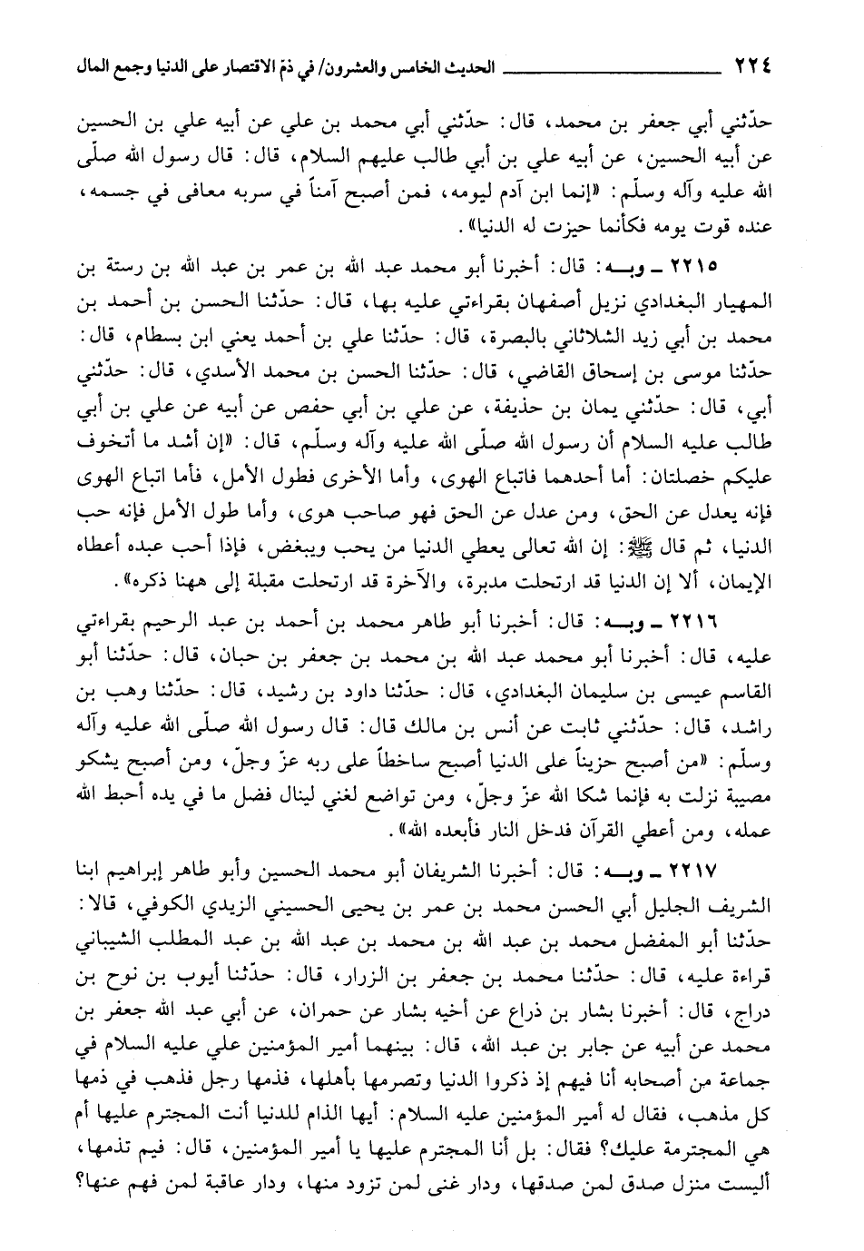2217 - أَخْبَرَنَا الشَّرِيفَانِ أَبُو مُحَمَّدٍ الْحُسَيْنُ , وَأَبُو طَاهِرٍ إِبْرَاهِيمُ ابْنَا الشَّرِيفِ الْجَلِيلِ أَبِي الْحَسَنِ مُحَمَّدِ بْنِ عُمَرَ بْنِ يَحْيَى الْحُسَيْنِيِّ الزَّيْدِيِّ الْكُوفِيِّ، قَالَا: حَدَّثَنَا أَبُو الْمُفَضَّلِ مُحَمَّدُ بْنُ عَبْدِ اللَّهِ بْنِ مُحَمَّدِ بْنِ عَبْدِ اللَّهِ بْنِ عَبْدِ الْمُطَّلِبِ الشَّيْبَانِيُّ , قِرَاءَةً عَلَيْهِ، قَالَ: حَدَّثَنَا مُحَمَّدُ بْنُ جَعْفَرِ بْنِ الزَّرَّارُ، قَالَ: حَدَّثَنَا أَيُّوبُ بْنُ نُوحِ بْنِ دَرَّاجٍ، قَالَ: أَخْبَرَنَا بَشَّارُ بْنُ ذِرَاعٍ، عَنْ أَخِيهِ بَشَّارٍ، عَنْ حُمْرَانَ، عَنْ أَبِي عَبْدِ اللَّهِ جَعْفَرِ بْنِ مُحَمَّدٍ عَنْ أَبِيهِ، عَنْ جَابِرِ بْنِ عَبْدِ اللَّهِ، قَالَ: بَيْنَمَا أَمِيرُ الْمُؤْمِنِينَ عَلِيٌّ عَلَيْهِ السَّلَامُ فِي جَمَاعَةٍ مِنْ أَصْحَابِهِ أَنَا فِيهِمْ، إِذْ ذَكَرُوا الدَّنْيَا وَتَصَرُّمَهَا بِأَهْلِهَا، فَذَمَّهَا رَجُلٌ، فَذَهَبَ فِي ذَمِّهَا كُلَّ مَذْهَبٍ، فَقَالَ لَهُ أَمِيرُ الْمُؤْمِنِينَ عَلَيْهِ السَّلَامُ: " أَيُّهَا الذَّامُّ لِلدُّنْيَا أَنْتَ الْمُجْتَرِمُ عَلَيْهِا أَمْ هِيَ الْمُجْتَرِمَةُ عَلَيْكَ؟ فَقَالَ: بَلْ أَنَا الْمُجْتَرِمُ عَلَيْهَا يَا أَمِيرَ الْمُؤْمِنِينَ، قَالَ: فِيمَ تَذُمُّهَا؟ أَلَيْسَتْ مَنْزِلَ صِدْقٍ لِمَنْ صَدَقَهَا، وَدَارَ غِنًى لِمَنْ تَزَوَّدَ مِنْهَا، وَدَارَ عَاقِبَةٍ لِمَنْ فَهِمَ عَنْهُا؟