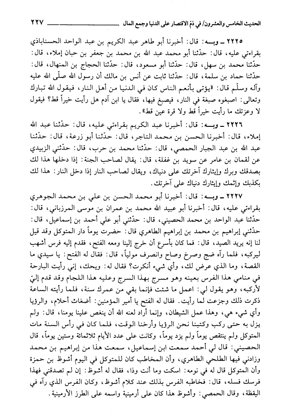 2227 - أَخْبَرَنَا أَبُو مُحَمَّدٍ الْحَسَنُ بْنُ عَلِيِّ بْنِ مُحَمَّدٍ الْجَوْهَرِيُّ , بِقِرَاءَتِي عَلَيْهِ، قَالَ: أَخْبَرَنَا أَبُو عُبَيْدِ اللَّهِ مُحَمَّدُ بْنُ عِمْرَانَ بْنِ مُوسَى الْمَرْزُبَانِيُّ، قَالَ: حَدَّثَنَا عَبْدُ الْوَاحِدِ بْنُ مُحَمَّدٍ الْحَصِينِيُّ، قَالَ: حَدَّثَنِي أَبُو عَلِيٍّ أَحْمَدُ بْنُ إِسْمَاعِيلَ، قَالَ: حَدَّثَنِي إِبْرَاهِيمُ بْنُ مُحَمَّدِ بْنِ إِبْرَاهِيمَ الطَّاهِرِيُّ , قَالَ: حَضَرْتُ يَوْمًا دَارَ الْمُتَوَكِّلِ , وَقَدْ قِيلَ لَنَا: إِنَّهُ يُرِيدُ الصَّيْدَ، قَالَ: فَمَا كَانَ بِأَسْرَعَ أَنْ خَرَجَ إِلَيْنَا , وَمَعَهُ الْفَتْحُ، فَقَدَّمَ إِلَيْهِ فَرَسًا أَشْهَبَ , لِيَرْكَبَهُ، فَمَا رَآهُ ضَخَّ، وَصَرَخَ، وَصَاحَ، وَانْصَرَفَ مُوَلِّيًا، قَالَ: فَقَالَ لَهُ الْفَتْحُ: سَيِّدِي مَا الْقِصَّةُ، وَمَا الَّذِي عُرِضَ لَكَ، وَأَيَّ شَيْءٍ أَنْكَرْتَ؟ فَقَالَ لَهُ: وَيْحَكَ، إِنِّي رَأَيْتُ الْبَارِحَةَ فِي مَنَامِي هَذَا الْفَرَسَ بِعَيْنِهِ , وَهُوَ مُسْرَجٌ , وَعَلَيْهِ هَذِهِ اللِّجَامُ، وَقَدْ قُدِّمَ إِلَيَّ , لِأَرْكَبَهُ، وَهُوَ يَقُولُ لِي: اعْمَلْ مَا شِئْتَ فَإِنَّمَا بَقِيَ مِنْ عُمْرِكَ سَنَةً، فَلَمَّا رَأَيْتُهُ السَّاعَةَ ذَكَرْتُ ذَلِكَ , وَجَزِعْتُ لَمَّا رَأَيْتُ، فَقَالَ لَهُ الْفَتْحُ يَا أَمِيرَ الْمُؤْمِنِينَ: أَضْغَاثُ أَحْلَامٍ، وَالرُّؤْيَا وَأَيُّ شَيْءٍ هِيَ، وَهَذَا عَمَلُ الشَّيْطَانِ، وَإِنَّمَا أَرَادَ لَعَنَهُ اللَّهُ أَنْ يُنَغِّصَ عَلَيْنَا يَوْمَنَا، قَالَ: وَلَمْ يَزَلْ بِهِ , حَتَّى رَكِبَ، وَكَتَبْنَا نَحْنُ الرُّؤْيَا، وَأَرَّخْنَا الْوَقْتَ، فَلَمَّا كَانَ فِي رَأْسِ السَّنَةِ , مَاتَ الْمُتَوَكِّلُ، وَلَمْ يَنْتَقِصْ يَوْمًا وَلَمْ يَزِدْ يَوْمًا، وَكَانَتْ عَلَى عَدَدِ الْأَيَّامِ ثَلَاثَ مِائَةٍ وَسِتِّينَ يَوْمًا، قَالَ: الْحَصِينِيُّ، قَالَ لِي أَحْمَدُ سَمِعْتُ ابْنَ إِسْمَاعِيلَ، سَمِعْتُ هَذَا مِنْ إِبْرَاهِيمَ بْنِ مُحَمَّدٍ، وَزَادَنِي فِيهَا الطَّلْحِيُّ الطَّاهِرِيُّ، وَأَنَّ الْمُخَاطَبَ كَانَ لِلْمُتَوَكِّلِ فِي الْيَوْمِ أَشْوَظُ بْنُ حَمْزَةَ، وَأَنَّ الْمُتَوَكِّلَ قَالَ لَهُ فِي نَوْمِهِ: اسْكُتْ وَمَا أَنْتَ وَذَا؟ ، فَقَالَ لَهُ أَشْوَظُ: إِنْ لَمْ تُصَدِّقْنِي , فَهَذَا فَرَسُكَ , فَسَلْهُ، قَالَ: فَخَاطَبَهُ الْفَرَسُ بِذَلِكَ عِنْدَ كَلَامِ أَشْوَظَ، وَكَانَ الْفَرَسُ الَّذِي رَآهُ فِي الْيَقَظَةِ، وَقَالَ الْحِمْصِيُّ وَأَشْوَظُ هَذَا كَانَ عَلَى