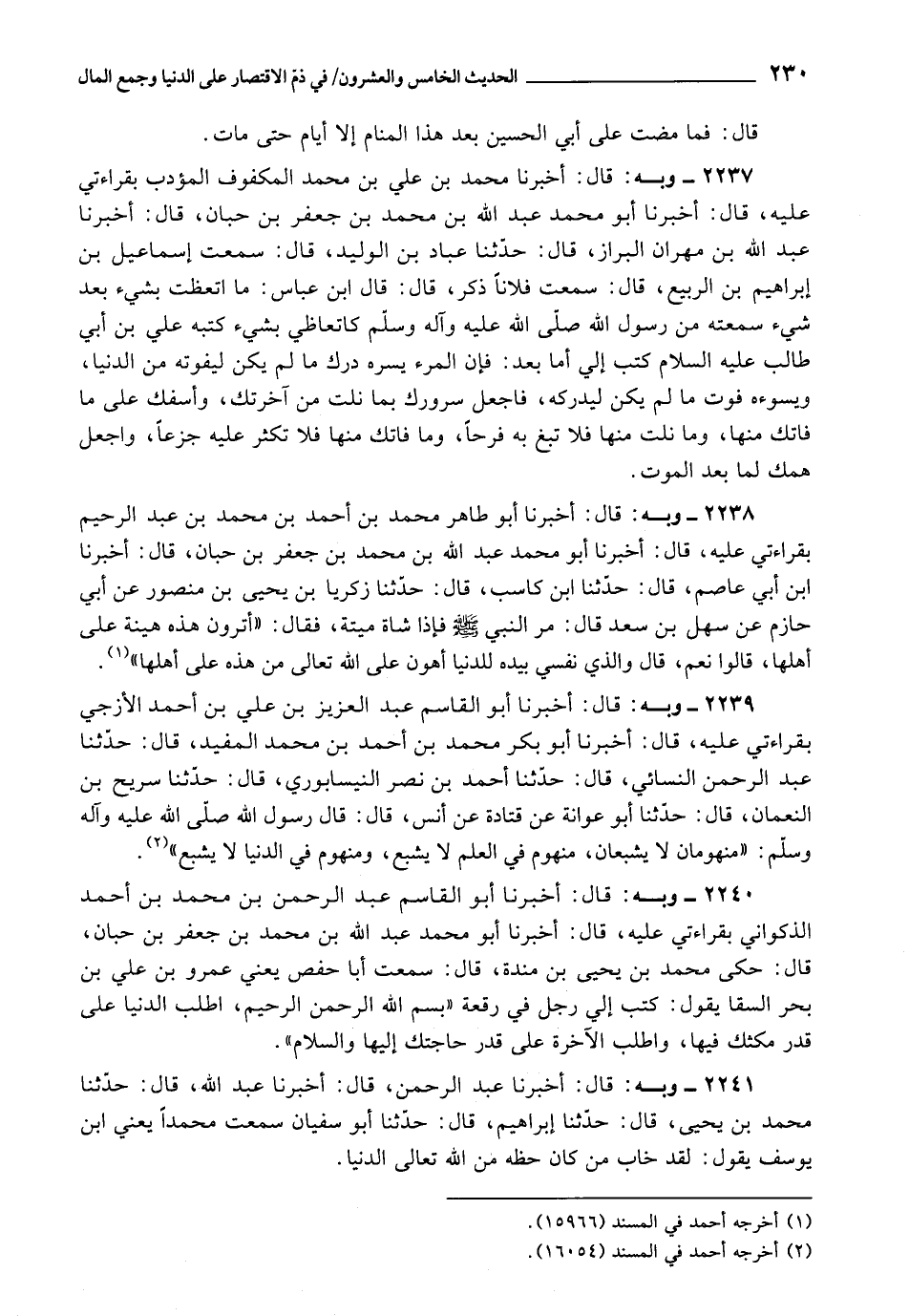 2239 - أَخْبَرَنَا أَبُو الْقَاسِمِ عَبْدُ الْعَزِيزِ بْنُ عَلِيِّ بْنِ أَحْمَدَ الْأَزَجِيُّ , بِقِرَاءَتِي عَلَيْهِ، قَالَ: أَخْبَرَنَا أَبُو بَكْرٍ مُحَمَّدُ بْنُ أَحْمَدَ بْنِ مُحَمَّدٍ الْمُفِيدُ، قَالَ: حَدَّثَنَا عَبْدُ الرَّحْمَنِ النَّسَائِيُّ، قَالَ: حَدَّثَنَا أَحْمَدُ بْنُ نَصْرٍ النَّيْسَابُورِيُّ، قَالَ: حَدَّثَنَا سُرَيْحُ بْنُ النُّعْمَانِ، قَالَ: حَدَّثَنَا أَبُو عَوَانَةَ، عَنْ قَتَادَةَ، عَنْ أَنَسٍ، قَالَ: قَالَ رَسُولُ اللَّهِ صَلَّى اللَّهُ عَلَيْهِ وَآلِهِ وَسَلَّمَ: «مَنْهُومَانِ لَا يَشْبَعَانِ، مَنْهُومٌ فِي الْعِلْمِ لَا يَشْبَعُ، وَمَنْهُومٌ فِي الدُّنْيَا لَا يَشْبَعُ»