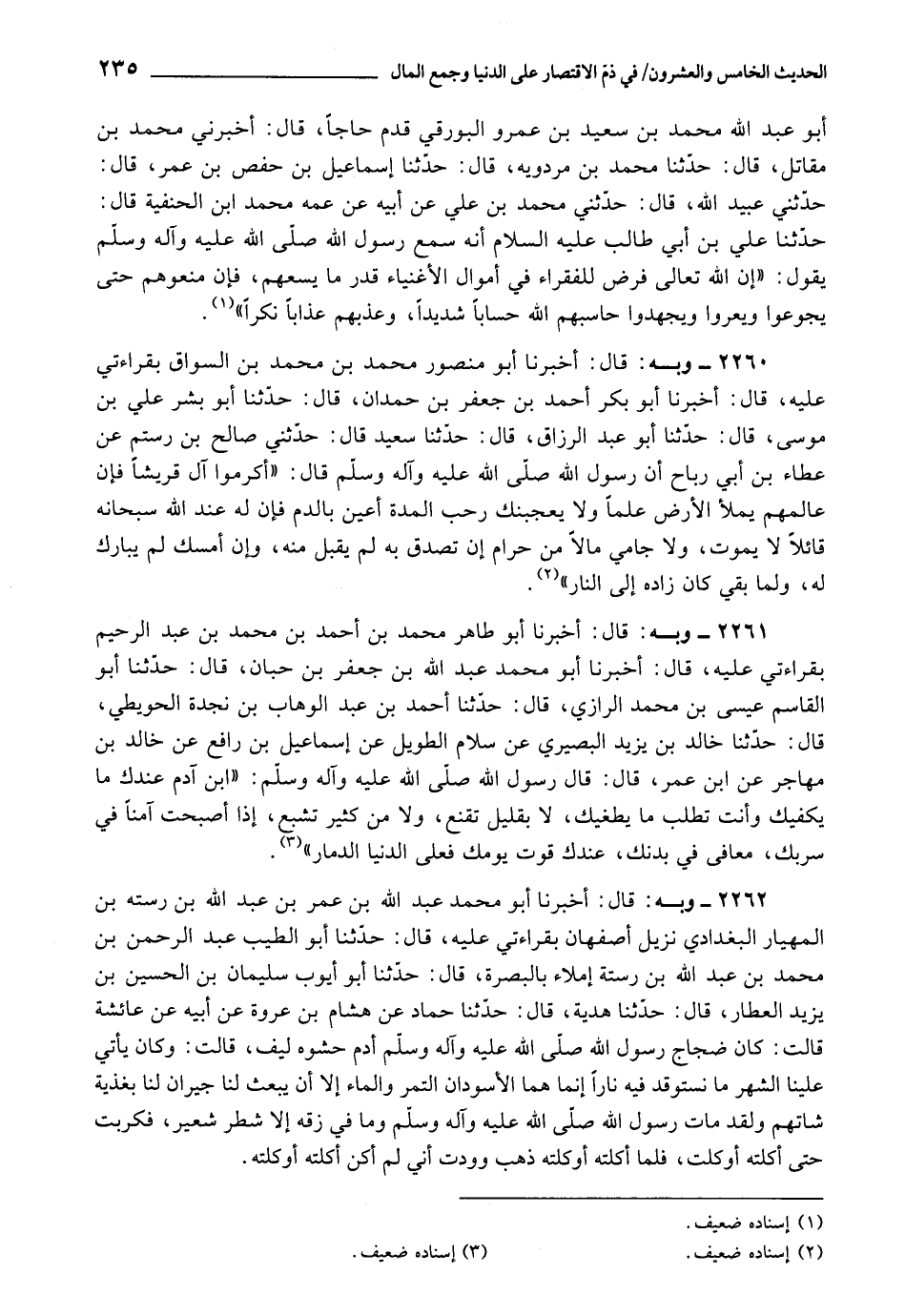 2261 - أَخْبَرَنَا أَبُو طَاهِرٍ مُحَمَّدُ بْنُ أَحْمَدَ بْنِ عَبْدِ الرَّحِيمِ , بِقِرَاءَتِي عَلَيْهِ، قَالَ: أَخْبَرَنَا أَبُو مُحَمَّدٍ عَبْدُ اللَّهِ بْنُ جَعْفَرِ بْنِ حِبَّانَ، قَالَ: حَدَّثَنَا أَبُو الْقَاسِمِ عِيسَى بْنُ مُحَمَّدٍ الرَّازِيُّ، قَالَ: حَدَّثَنَا أَحْمَدُ بْنُ عَبْدِ الْوَهَّابِ بْنِ نَجْدَةَ الْحُوَيْطِيُّ، قَالَ: حَدَّثَنَا خَالِدُ بْنُ يَزِيدَ الْبُصَيْرِيُّ، عَنْ سَلَّامٍ الطَّوِيلِ، عَنْ إِسْمَاعِيلَ بْنِ رَافِعٍ، عَنْ خَالِدِ بْنِ مُهَاجِرٍ، عَنِ ابْنِ عُمَرَ، قَالَ: قَالَ رَسُولُ اللَّهِ صَلَّى اللَّهُ عَلَيْهِ وَآلِهِ وَسَلَّمَ: «ابْنَ آدَمَ، عِنْدَكَ مَا يَكْفِيكَ، وَأَنْتَ تَطْلُبُ مَا يُطْغِيكَ، لَا بِقَلِيلٍ تَقْنَعُ، وَلَا مِنْ كَثِيرٍ تَشْبَعُ، إِذَا أَصْبَحْتَ آمِنًا فِي سِرْبِكَ، مُعَافًى فِي بَدَنِكَ، عِنْدَكَ قُوتُ يَوْمِكَ , فَعَلَى الدُّنْيَا الدَّمَارُ»