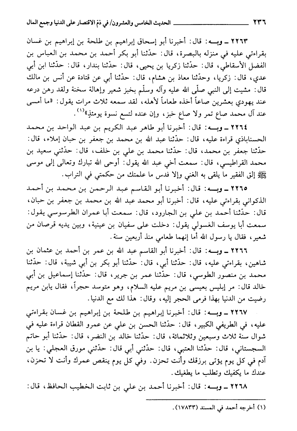2266 - أَخْبَرَنَا أَبُو الْقَاسِمِ عَبْدُ اللَّهِ بْنُ عُمَرَ بْنِ أَحْمَدَ بْنِ عُثْمَانَ بْنِ شَاهِينَ، بِقِرَاءَتِي عَلَيْهِ، قَالَ: حَدَّثَنَا أَبِي قَالَ: حَدَّثَنَا أَبُو بَكْرِ بْنُ أَبِي شَيْبَةَ، قَالَ: حَدَّثَنَا مُحَمَّدُ بْنُ مَنْصُورٍ الطُّوسِيُّ، قَالَ: حَدَّثَنَا عُمَرُ بْنُ جَرِيرٍ، قَالَ: حَدَّثَنَا إِسْمَاعِيلُ بْنُ أَبِي خَالِدٍ , قَالَ: مَرَّ إِبْلِيسُ بِعِيسَى بْنِ مَرْيَمَ عَلَيْهِ السَّلَامُ، وَهُوَ مُتَوَسِّدُ حَجَرًا، فَقَالَ: يَا بْنَ مَرْيَمَ رَضِيتَ مِنَ الدُّنْيَا بِهَذَا , فَرَمَى الْحَجَرَ إِلَيْهِ، وَقَالَ: هَذَا لَكَ مَعَ الدُّنْيَا.