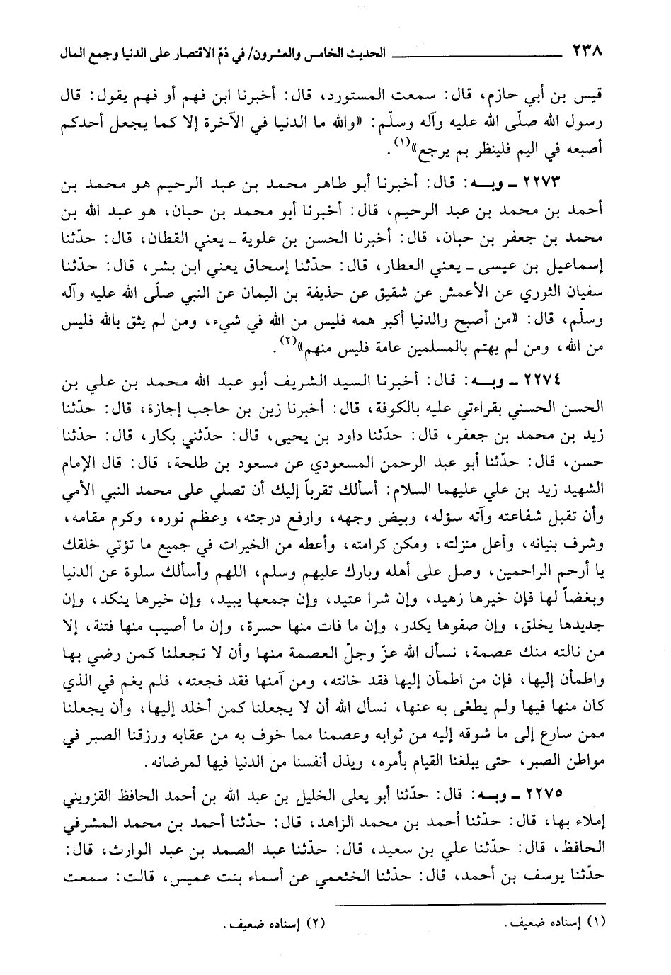 2274 - أَخْبَرَنَا السَّيِّدُ الشَّرِيفُ أَبُو عَبْدِ اللَّهِ بْنُ مُحَمَّدِ بْنِ عَلِيِّ بْنِ الْحَسَنِ الْحَسَنِيُّ , بِقِرَاءَتِي عَلَيْهِ بِالْكُوفَةِ، أَخْبَرَنَا زَيْنُ بْنُ حَاجِبٍ , إِجَازَةً، قَالَ: حَدَّثَنَا زَيْدُ بْنُ مُحَمَّدِ بْنِ جَعْفَرٍ، قَالَ: حَدَّثَنَا دَاوُدُ بْنُ يَحْيَى، قَالَ: حَدَّثَنِي بَكَّارٌ، قَالَ: حَدَّثَنَا حَسَنٌ، قَالَ: حَدَّثَنَا أَبُو عَبْدِ الرَّحْمَنِ الْمَسْعُودِيُّ، عَنْ مَسْعُودِ بْنِ طَلْحَةَ، قَالَ: قَالَ الْإِمَامُ الشَّهِيدُ زَيْدُ بْنُ عَلِيٍّ عَلَيْهِمَا السَّلَامُ: أَسْأَلُكَ , تَقَرُّبًا إِلَيْكَ أَنْ تُصَلِّيَ عَلَى مُحَمَّدٍ النَّبِيِّ صَلَّى اللَّهُ عَلَيْهِ وَآلِهِ وَسَلَّمَ الْأُمِّيِّ، وَأَنْ تَقْبَلَ شَفَاعَتَهُ، وَآتِهِ سُؤْلَهُ، وَبَيِّضْ وَجْهَهُ، وَارْفَعْ دَرَجَتَهُ، وَعَظِّمْ نُورَهُ، وَكَرِّمْ مَقَامَهُ، وَشَرِّفْ بُنْيَانَهُ، وَأَعْلِ مَنْزِلَتَهُ، وَمَكِّنْ كَرَامَتَهُ، وَأَعْطِهِ مِنَ الْخَيْرَاتِ فِي جَمِيعِ مَا تُؤْتِي خَلْقَكَ يَا أَرْحَمَ الرَّاحِمِينَ، وَصَلِّ عَلَى أَهْلِهِ , وَبَارِكْ عَلَيْهِمْ وَسَلِّمْ، اللَّهُمَّ وَأَسْأَلُكَ سَلْوَةً عَنِ الدُّنْيَا، وَبُغْضًا لَهَا؛ فَإِنَّ خَيْرَهَا زَهِيدٌ، وَإِنَّ شَرَّهَا عَتِيدٌ، وَإِنَّ جَمْعَهَا يَبِيدُ، وَإِنَّ خَيْرَهَا يَنْكَدُ، وَإِنَّ جَدِيدَهَا يَخْلُقُ، وَإِنَّ صَفْوَهَا يَكْدَرُ، وَإِنَّ مَا فَاتَ مِنْهَا حَسْرَةٌ، وَإِنَّ مَا أُصِيبَ مِنْهَا فِتْنَةٌ، إِلَّا مَنْ نَالَتْهُ مِنْكَ عِصْمَةٌ، نَسْأَلُ اللَّهَ عَزَّ وَجَلَّ الْعِصْمَةَ مِنْهَا، وَأَنْ لَا تَجْعَلَنَا كَمَنْ رَضِيَ بِهَا، وَاطْمَأَنَّ إِلَيْهَا فَقَدْ خَانَتْهُ، وَمَنْ آمَنَهَا قَدْ فَجِعَتْهُ، فَلَمْ يُغَمَّ فِي الَّذِي كَانَ مِنْهَا فِيهَا وَلَمْ يَطْغَ بِهَا عَنْهُا، نَسْأَلُ اللَّهَ أَنْ لَا يَجْعَلَنَا كَمَنْ أَخْلَدَ إِلَيْهَا، وَأَنْ يَجْعَلَنَا مِمَّنْ سَارَعَ إِلَى مَا شَوَّقَهُ إِلَيْهِ مِنْ ثَوَابِهِ، وَعَصَمَنَا مِمَّا خَوَّفَ بِهِ مِنْ عِقَابِهِ، وَرَزَقَنَا الصَّبْرَ فِي مَوَاطِنِ الصَّبْرِ، حَتَّى يُبَلِّغَنَا الْقِيَامَ بِأَمْرِهِ، وَيَذِلَّ أَنْفُسَنَا مِنَ الدُّنْيَا فِيهَا لِمَرْضَاتِهِ.