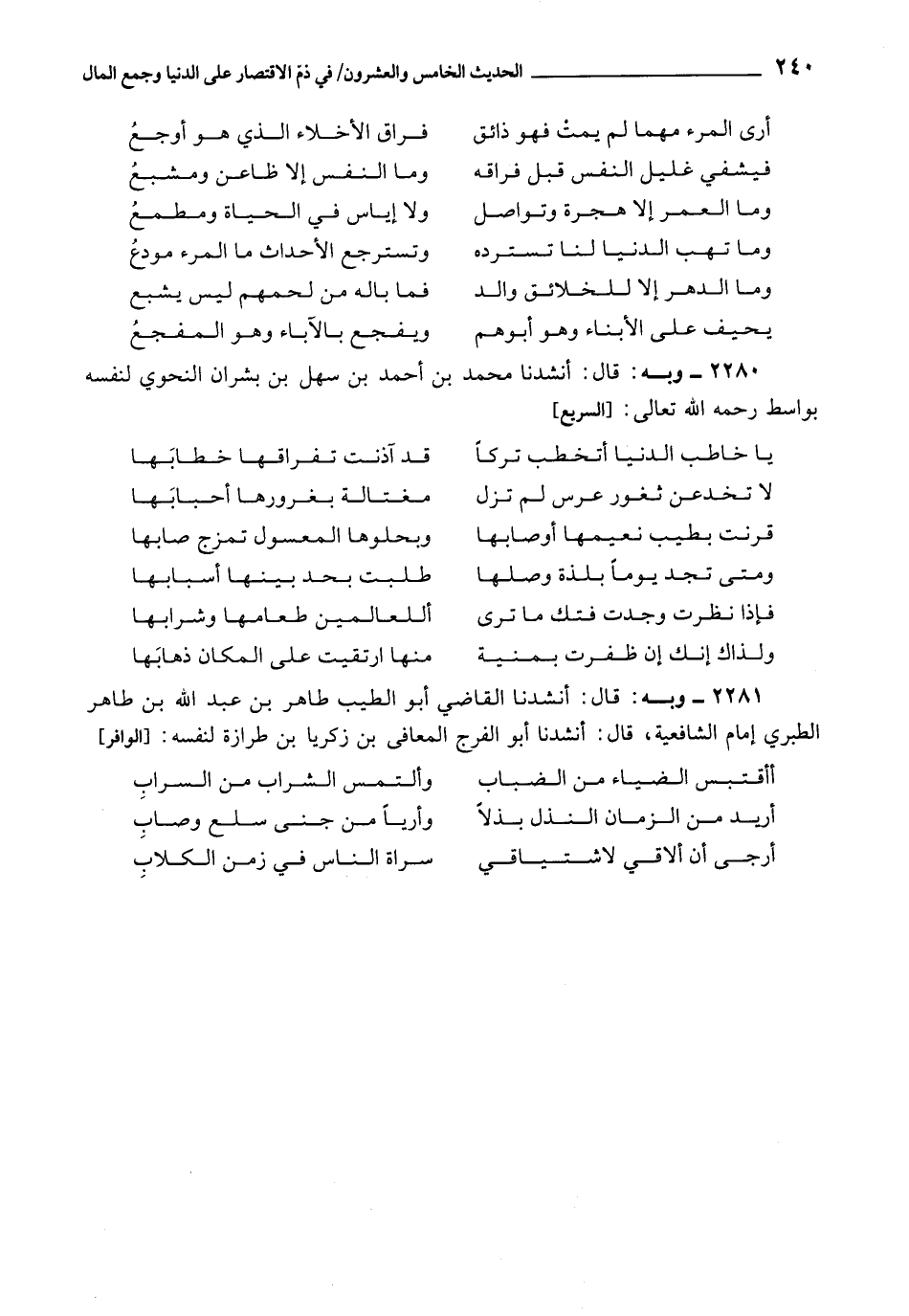 2281 - أَنْشَدَنَا الْقَاضِي أَبُو الطَّيِّبِ طَاهِرُ بْنُ عَبْدِ اللَّهِ بْنِ طَاهِرٍ الطَّبَرِيُّ إمَامُ الشَّافِعِيَّةِ، قَالَ: أَنْشَدَنَا أَبُو الْفَرَجِ الْمُعَافَى بْنُ زَكَرِيَّا بْنِ طِرَازَةَ لِنَفْسِهِ:
