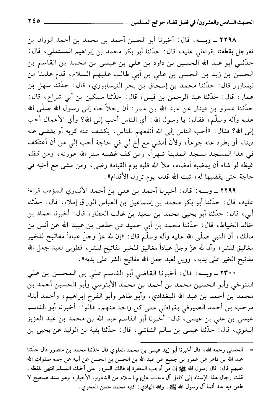 2298 - أَخْبَرَنَا أَبُو الْحَسَنِ أَحْمَدُ بْنُ مُحَمَّدِ بْنِ أَحْمَدَ الْوَزَّانُ بْنُ قَفَرْجَلٍ , بِقَطَفْتَا بِقِرَاءَتِي عَلَيْهِ، قَالَ: حَدَّثَنَا أَبُو بَكْرٍ مُحَمَّدُ بْنُ إِبْرَاهِيمَ الْمُسْتَمْلِي، قَالَ: حَدَّثَنِي أَبُو عَبْدِ اللَّهِ الْحُسَيْنُ بْنُ دَاوُدَ بْنِ عَلِيِّ بْنِ عِيسَى بْنِ مُحَمَّدِ بْنِ الْقَاسِمِ بْنِ الْحَسَنِ بْنِ زَيْدِ بْنِ الْحَسَنِ بْنِ عَلِيِّ بْنِ أَبِي طَالِبٍ عَلَيْهِمُ السَّلَامُ، قَدِمَ عَلينا مِنْ نَيْسَابُورَ، قَالَ: حَدَّثَنَا مُحَمَّدُ بْنُ إِسْحَاقَ بْنِ بَحْرٍ النَّيْسَابُورِيُّ، قَالَ: حَدَّثَنَا سَهْلُ بْنُ عَمَّارٍ، قَالَ: حَدَّثَنَا عَبْدُ الرَّحْمَنِ بْنُ قَيْسٍ، قَالَ: حَدَّثَنَا مِسْكِينُ بْنُ أَبِي شُرَاحٍ، قَالَ: حَدَّثَنَا عَمْرُو بْنُ دِينَارٍ، عَنْ عَبْدِ اللَّهِ بْنِ عُمَرَ، أَنَّ رَجُلًا جَاءَ إِلَى رَسُولِ اللَّهِ صَلَّى اللَّهُ عَلَيْهِ وَآلِهِ وَسَلَّمَ، فَقَالَ يَا رَسُولَ اللَّهِ: أَيُّ النَّاسِ أَحَبُّ إِلَى اللَّهِ؟ وَأَيُّ الْأَعْمَالِ أَحَبُّ إِلَى اللَّهِ؟ ، فَقَالَ: «أَحَبُّ النَّاسِ إِلَى اللَّهِ أَنْفَعُهُمْ لِلنَّاسِ، يَكْشِفُ عَنْهُ كُرْبَةً، أَوْ يَقْضِي عَنْهُ دَيْنًا، أَوْ يَطْرُدُ عَنْهُ جُوعًا، وَلَئِنْ أَمْشِي مَعَ أَخٍ لِي فِي حَاجَةٍ أَحَبُّ إِلَيَّ مِنْ أَنْ أَعْتَكِفَ فِي هَذَا الْمَسْجِدِ مَسْجِدِ الْمَدِينَةِ شَهْرًا، وَمَنْ كَفَّ غَضَبَهُ سَتَرَ اللَّهُ عَوْرَتَهُ، وَمَنْ كَظَمَ غَيْظَهُ لَوْ شَاءَ أَنْ يُمْضِيَهُ أَمْضَاهُ، مَلَأَ اللَّهُ قَلْبَهُ يَوْمَ الْقِيَامَةِ رِضًى، وَمَنْ مَشَى مَعَ أَخِيهِ فِي حَاجَةٍ يَقْضِيهَا لَهُ، ثَبَّتَ اللَّهُ قَدَمَهُ يَوْمَ تَزِلُّ الْأَقْدَامُ»