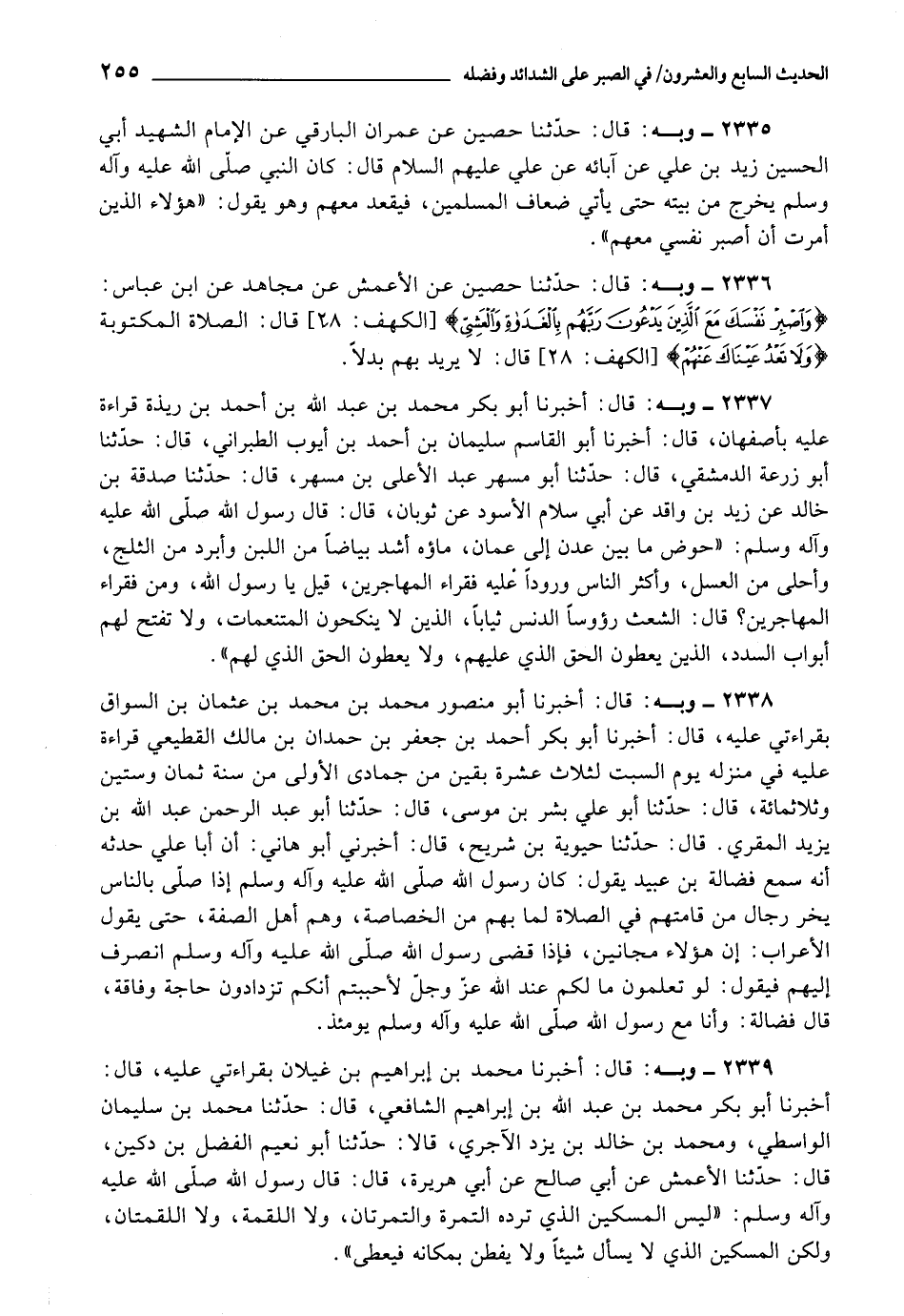 2335 - حَدَّثَنَا حُصَيْنٌ، عَنْ عِمْرَانَ الْبَارِقِيِّ، عَنِ الْإِمَامِ الشَّهِيدِ أَبِي الْحُسَيْنِ زَيْدِ بْنِ عَلِيٍّ، عَنْ آبَائِهِ، عَنْ عَلِيٍّ عَلَيْهِمُ السَّلَامُ قَالَ: كَانَ النَّبِيُّ صَلَّى اللَّهُ عَلَيْهِ وَآلِهِ وَسَلَّمَ يَخْرُجُ مِنْ بَيْتِهِ حَتَّى " يَأْتِيَ ضِعَافُ الْمُسْلِمِينَ، فَيَقْعُدُ مَعَهُمْ , وَهُوَ يَقُولُ: هَؤُلَاءِ الَّذِينَ أُمِرْتُ أَنْ أَصْبِرَ نَفْسِي مَعَهُمْ "