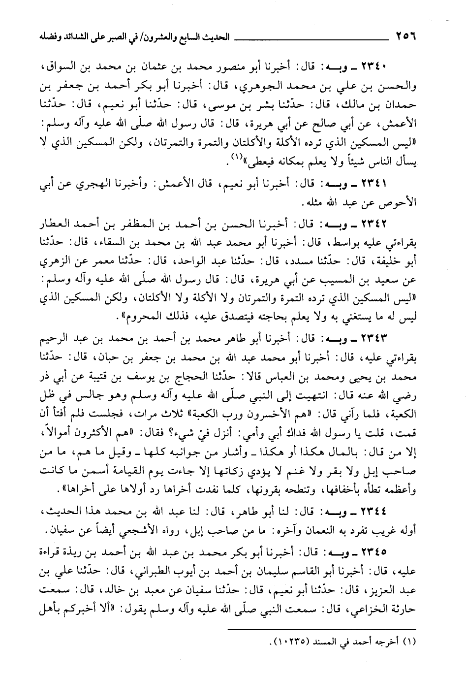 2343 - أَخْبَرَنَا أَبُو طَاهِرِ بْنُ أَحْمَدَ بْنِ مُحَمَّدِ بْنِ عَبْدِ الرَّحِيمِ , بِقِرَاءَتِي عَلَيْهِ، قَالَ: أَخْبَرَنَا أَبُو مُحَمَّدٍ عَبْدُ اللَّهِ بْنُ مُحَمَّدِ بْنِ جَعْفَرِ بْنِ حِبَّانَ، قَالَ: حَدَّثَنَا مُحَمَّدُ بْنُ يَحْيَى، وَمُحَمَّدُ بْنُ الْعَبَّاسِ , قَالَا: حَدَّثَنَا الْحَجَّاجُ بْنُ يُوسُفَ بْنِ قُتَيْبَةَ، عَنْ أَبِي ذَرٍّ رَضِيَ اللَّهُ عَنْهُ، قَالَ: انْتَهَيْتُ إِلَى النَّبِيِّ صَلَّى اللَّهُ عَلَيْهِ وَآلِهِ وَسَلَّمَ وَهُوَ جَالِسٌ فِي ظِلِّ الْكَعْبَةِ، فَمَا رَآنِي قَالَ: " هُمُ الْأَخْسَرُونَ وَرَبِّ الْكَعْبَةِ، ثَلَاثَ مَرَّاتٍ، فَجَلَسْتُ , فَلَمْ أَفْتَأْ أَنْ قُمْتُ، قُلْتُ: يَا رَسُولَ اللَّهِ، فَدَاكَ أَبِي وَأُمِّي، أَنَزَلَ فِيَّ شَيْءٌ؟ فَقَالَ: هُمُ الْأَكْثَرُونَ أَمْوَالًا، إِلَّا مَنْ قَالَ: بِالْمَالِ هَكَذَا أَوْ هَكَذَا، وَأَشَارَ مِنْ جَوَانِبِهِ كُلِّهَا، وَقِيلَ: مَا هُمْ؟ مَا مِنْ صَاحِبِ إِبِلٍ، وَلَا بَقَرٍ، وَلَا غَنَمٍ لَا يُؤَدِّي زَكَاتَهَا , إِلَّا جَاءَتْ يَوْمَ الْقِيَامَةِ أَسْمَنُ مَا كَانَتْ , وَأَعْظَمُهُ تَطَأُهُ بِأَخْفَافِهَا، وَتَنْطَحُهُ بِقُرُونِهَا، كُلَّمَا نَفَدَتْ أُخْرَاهَا , رَدَّ أُولَاهَا عَلَى أُخْرَاهَا ".
