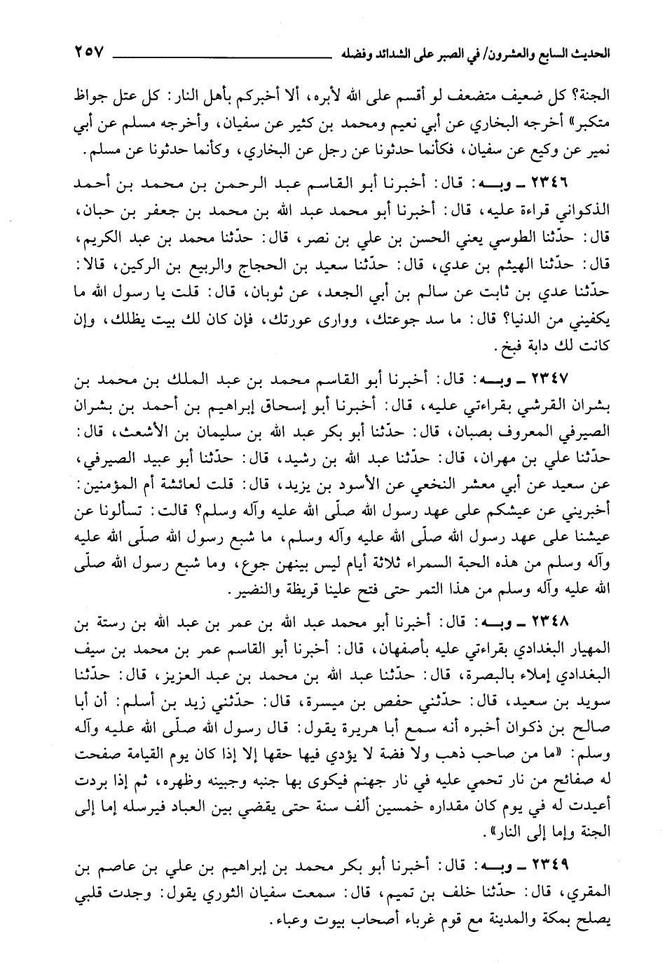 2346 - أَخْبَرَنَا أَبُو الْقَاسِمِ عَبْدُ الرَّحْمَنِ بْنُ مُحَمَّدِ بْنِ أَحْمَدَ الذَّكْوَانِيُّ , قِرَاءَةً عَلَيْهِ، قَالَ: أَخْبَرَنَا أَبُو مُحَمَّدٍ عَبْدُ اللَّهِ بْنُ مُحَمَّدِ بْنِ جَعْفَرِ بْنِ حِبَّانَ، قَالَ: حَدَّثَنَا الطُّوسِيُّ يَعْنِي الْحَسَنَ بْنَ عَلِيِّ بْنِ نَصْرٍ، قَالَ: حَدَّثَنَا مُحَمَّدُ بْنُ عَبْدِ الْكَرِيمِ، قَالَ: حَدَّثَنَا الْهَيْثَمُ بْنُ عَدِيٍّ، قَالَ: حَدَّثَنَا سَعِيدُ بْنُ الْحَجَّاجِ، وَالرَّبِيعُ بْنُ الرُّكَيْنِ، قَالَا: حَدَّثَنَا عَدِيُّ بْنُ ثَابِتٍ، عَنْ سَالِمِ بْنِ أَبِي الْجَعْدِ، عَنْ ثَوْبَانَ، قَالَ: قُلْتُ: يَا رَسُولَ اللَّهِ، مَا يَكْفِينِي مِنَ الدُّنْيَا؟ قَالَ: «مَا سَدَّ جَوْعَتَكَ، وَوَارَى عَوْرَتَكَ، فَإِنْ كَانَ لَكَ بَيْتٌ يُظِلُّكَ، وَإِنْ كَانَتْ لَكَ دَابَّةٌ فَبَخْ»