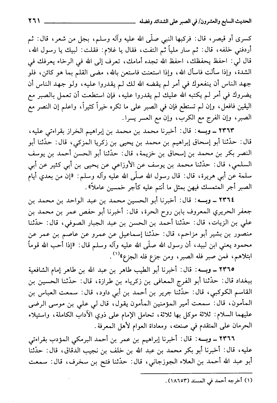 كِسْرَى أَوْ قَيْصَرُ، قَالَ: فَرَكِبَها النَّبِيُّ صَلَّى اللَّهُ عَلَيْهِ وَآلِهِ وَسَلَّمَ، بِجُلٍّ مِنْ شَعْرٍ , قَالَ: ثُمَّ أَرْدَفَنِي خَلْفَهُ، قَالَ: ثُمَّ سَارَ مَلِيًّا، ثُمَّ الْتَفَتَ، فَقَالَ: يَا غُلَامُ، فَقُلْتُ: لَبَّيْكَ يَا رَسُولَ اللَّهِ، قَالَ: احْفَظِ اللَّهَ يَحْفَظْكَ، احْفَظِ اللَّهَ تَجِدْهُ أمَامَكَ، تَعَرَّفْ إِلَى اللَّهِ فِي الرَّخَاءِ , يَعْرِفْكَ فِي الشِّدَّةِ، وَإِذَا سَأَلْتَ فَاسْأَلِ اللَّهَ، وَإِذَا اسْتَعَنْتَ فَاسْتَعِنْ بِاللَّهِ، مَضَى الْقَلَمُ بِمَا هُو كَائِنٌ، فَلَوْ جَهَدَ النَّاسُ أَنْ يَنْفَعُوكَ فِي أَمْرٍ لَمْ يَقْضِهِ اللَّهُ لَكَ لَمْ يَقْدِرُوا عَلَيْهِ، وَلَوْ جَهَدَ النَّاسُ أَنْ يَضُرُّوكَ بِشَيْءٍ لَمْ يَكْتُبْهُ اللَّهُ عَلَيْكَ لَمْ يَقْدِرُوا عَلَيْهِ، فَإِنِ اسْتَطَعْتَ أَنْ تَعْمَلَ بِالصَّبْرِ مَعَ الْيَقِينِ فَافْعَلْ، وَإِنْ لَمْ تَسْتَطِعْ فَإِنَّ فِي الصَّبْرِ عَلَى مَا تَكْرَهُ خَيْرًا كَثِيرًا، وَاعْلَمْ أَنَّ النَّصْرَ مَعَ الصَّبْرِ، وَأنَّ الْفَرَجَ مَعَ الْكَرْبِ، وَأنَّ مَعَ الْعُسْرِ يُسْرًا "