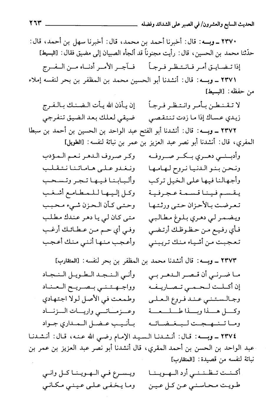 2374 - أَنْشَدَنَا عَبْدُ الْوَاحِدِ بْنُ الْحَسَنِ الْمُقْرِيُّ، قَالَ: أَنْشَدَنَا أَبُو نَصْرٍ عَبْدُ الْعَزِيزِ بْنُ عُمَرَ بْنِ نَبَاتَةَ لِنَفْسِهِ مِنْ قَصِيدَةٍ:
