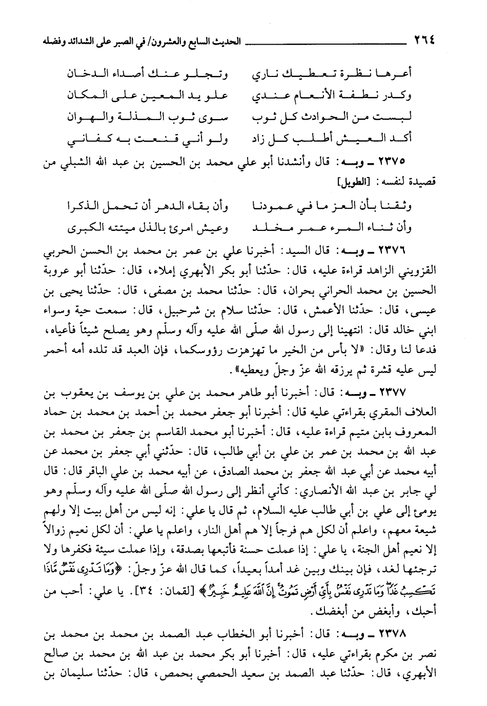 2377 - أَخْبَرَنَا أَبُو طَاهِرٍ مُحَمَّدُ بْنُ عَلِيِّ بْنِ يُوسُفَ بْنِ يَعْقُوبَ بْنِ الْعَلَّافِ الْمُقْرِيُّ بِقِرَاءَتِي عَلَيْهِ , قَالَ: أَخْبَرَنَا أَبُو جَعْفَرٍ مُحَمَّدُ بْنُ أَحْمَدَ بْنِ حَمَّادٍ الْمَعْرُوفُ بِابْنِ مُتَيَّمٍ قِرَاءَةً عَلَيْهِ، قَالَ: أَخْبَرَنَا أَبُو مُحَمَّدٍ الْقَاسِمُ بْنُ جَعْفَرِ بْنِ مُحَمَّدِ بْنِ عَبْدِ اللَّهِ بْنِ مُحَمَّدِ بْنِ عُمَرَ بْنِ عَلِيِّ بْنِ أَبِي طَالِبٍ، قَالَ: حَدَّثَنِي أَبِي جَعْفَرُ بْنُ مُحَمَّدٍ، عَنْ أَبِيهِ، عَنْ أَبِي عَبْدِ اللَّهِ جَعْفَرِ بْنِ مُحَمَّدٍ الصَّادِقِ عَنْ أَبِيهِ مُحَمَّدِ بْنِ عَلِيٍّ الْبَاقِرِ قَالَ: قَالَ لِي جَابِرُ بْنُ عَبْدِ اللَّهِ الْأَنْصَارِيُّ: كَأَنِّي أَنْظُرُ إِلَى رَسُولِ اللَّهِ صَلَّى اللَّهُ عَلَيْهِ وَآلِهِ وَسَلَّمَ , وَهُوَ يُومِئُ إِلَى عَلِيِّ بْنِ أَبِي طَالِبٍ عَلَيْهِ السَّلَامُ، ثُمَّ قَالَ يَا عَلِيُّ: " إِنَّهُ لَيْسَ مِنْ أَهْلِ بَيْتٍ , إِلَّا وَلَهُمْ شِيعَةٌ مَعَهُمْ، وَاعْلَمْ أَنَّ لِكُلِّ هَمٍّ فَرَجًا , إِلَّا هَمَّ أَهْلِ النَّارِ، وَاعْلَمْ يَا عَلِيُّ، أَنَّ لِكُلِّ نَعِيمٍ زَوَالًا , إِلَّا نَعِيمَ أَهْلِ الْجَنَّةِ، يَا عَلِيُّ: إِذَا عَمِلْتَ حَسَنَةً، فَأَتْبِعْهَا بِصَدَقَةٍ، وَإِذَا عَمِلْتَ سَيِّئَةٍ، فَكَفِّرْهَا، وَلَا تُرْجِئْهَا لِغَدٍ، فَإِنَّ بَيْنَكَ وَبَيْنَ غَدٍ أَمَدًا بَعِيدًا، كَمَا قَالَ اللَّهُ عَزَّ وَجَلَّ: {وَمَا تَدْرِي نَفْسٌ مَاذَا تَكْسِبُ غَدًا وَمَا تَدْرِي نَفْسٌ بِأَيِّ أَرْضٍ تَمُوتُ إِنَّ اللَّهَ عَلِيمٌ خَبِيرٌ} [لقمان: 34] .