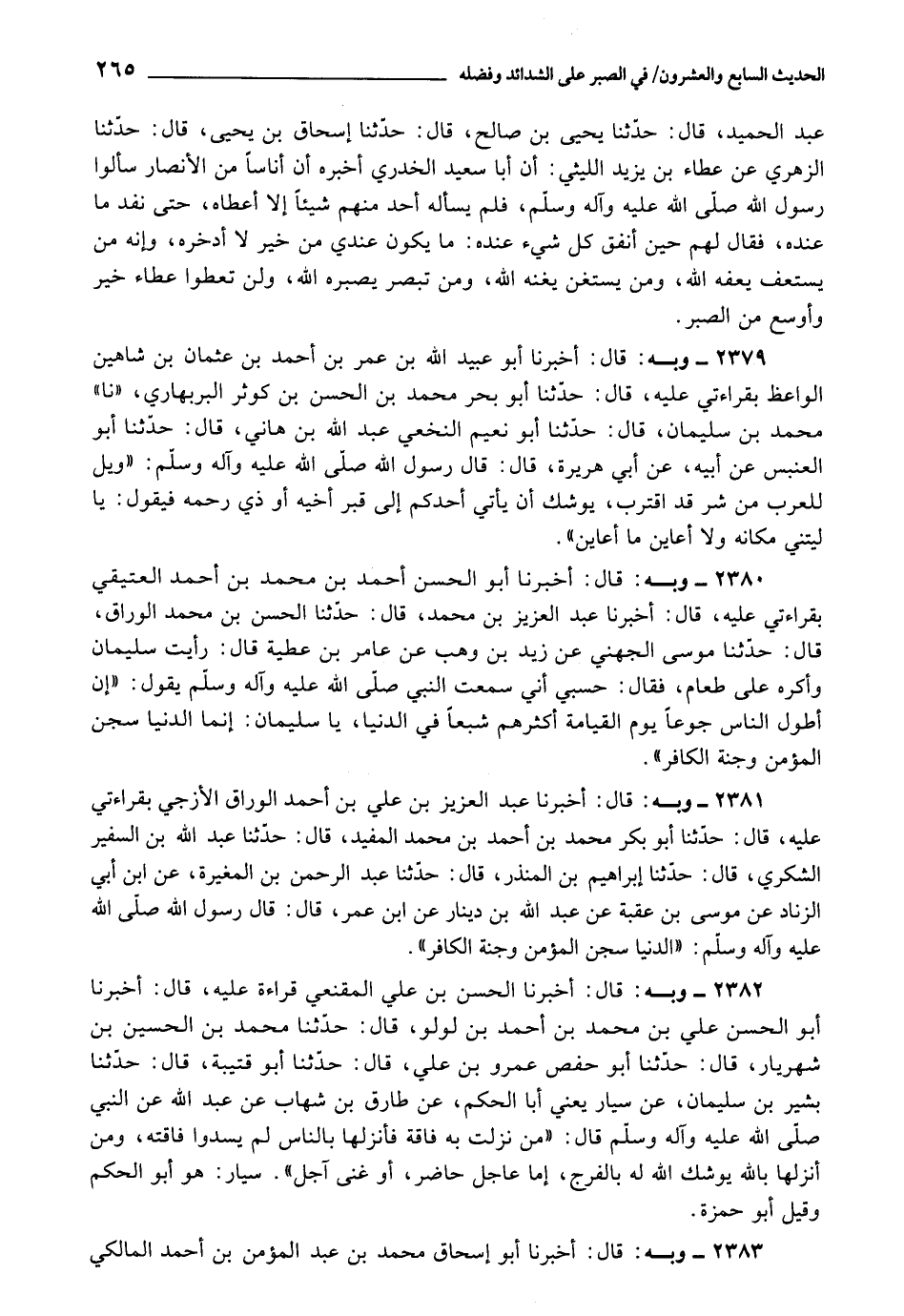 2380 - أَخْبَرَنَا أَبُو الْحَسَنِ أَحْمَدُ بْنُ مُحَمَّدِ بْنِ أَحْمَدَ الْعَتِيقِيُّ , بِقِرَاءَتِي عَلَيْهِ، قَالَ: أَخْبَرَنَا عَبْدُ الْعَزِيزِ بْنُ مُحَمَّدٍ، قَالَ: حَدَّثَنَا الْحَسَنُ بْنُ مُحَمَّدٍ الْوَرَّاقُ، قَالَ: حَدَّثَنَا مُوسَى الْجُهَنِيُّ، عَنْ زَيْدِ بْنِ وَهْبٍ، عَنْ عَطِيَّةَ بْنِ عَامِرِ قَالَ: رَأَيْتُ سَلْمَان , وَأَكْرَهُ عَلَى طَعَامٍ، فَقَالَ: حَسَبِي أَنِّي سَمِعْتُ رَسُولَ اللَّهِ صَلَّى اللَّهُ عَلَيْهِ وَآلِهِ وَسَلَّمَ يَقُولُ: " إِنَّ أَطْوَلَ النَّاسِ جُوعًا يَوْمَ الْقِيَامَةِ أَكْثَرُهُمْ شِبَعًا فِي الدُّنْيَا، يَا سُلَيْمَانُ: إِنَّمَا الدُّنْيَا سِجْنُ الْمُؤْمِنِ , وَجَنَّةُ الْكَافِرِ "