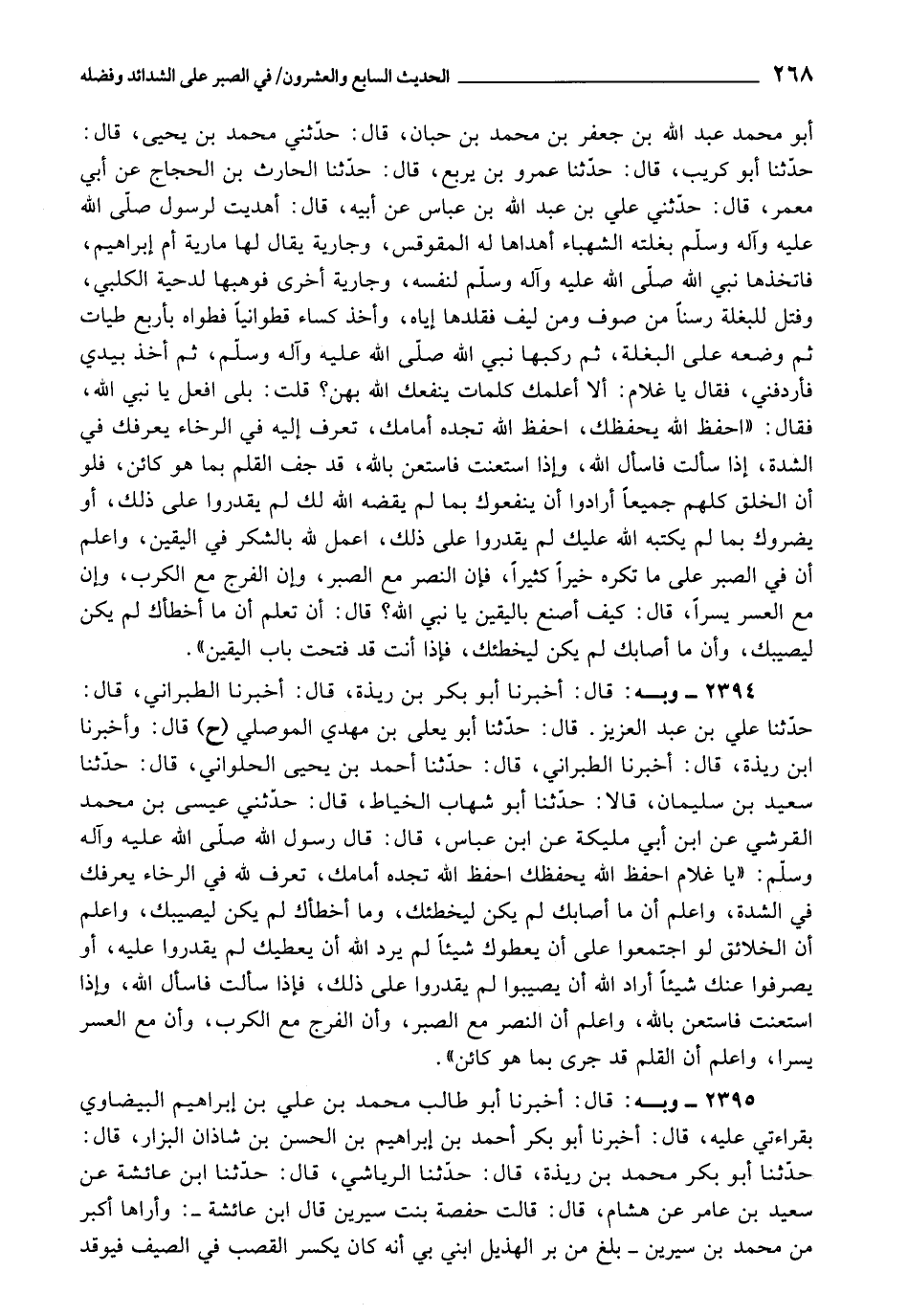 قَالَ: حَدَّثَنَا أَبُو يَعْلَى بْنُ مَهْدِيٍّ الْمَوْصِلِيُّ، ح قَالَ وَأَخْبَرَنَا ابْنُ رَيْذَةَ، قَالَ: أَخْبَرَنَا الطَّبَرَانِيُّ، قَالَ: حَدَّثَنَا أَحْمَدُ بْنُ يَحْيَى الْحُلْوَانِيُّ، قَالَ: حَدَّثَنَا سَعِيدُ بْنُ سُلَيْمَانَ، قَالَا: حَدَّثَنَا أَبُو شِهَابٍ الْخَيَّاطُ، قَالَ: حَدَّثَنِي عِيسَى بْنُ مُحَمَّدٍ الْقُرَشِيُّ، عَنِ ابْنِ أَبِي مَلِيكَةَ، عَنِ ابْنِ عَبَّاسٍ، قَالَ: قَالَ رَسُولُ اللَّهِ صَلَّى اللَّهُ عَلَيْهِ وَآلِهِ وَسَلَّمَ: يَا غُلَامُ احْفَظِ اللَّهَ يَحْفَظْكَ، احْفَظِ اللَّهَ تَجِدْهُ أمَامَكَ، تَعَرَّفْ لِلَّهِ فِي الرَّخَاءِ يَعْرِفْكَ فِي الشِّدَّةِ، وَاعْلَمْ أَنَّ مَا أَصَابَكَ لَمْ يَكُنْ لِيُخْطِئَكَ، وَمَا أَخْطَأَكَ لَمْ يَكُنْ لِيُصِيبَكَ، وَاعْلَمْ أَنَّ الْخَلَائِقَ لَوِ اجْتَمَعُوا عَلَى أَنْ يُعْطُوكَ شَيْئًا لَمْ يُرِدِ اللَّهُ أَنْ يُعْطِيَكَ لَمْ يَقْدِرُوا عَلَيْهِ، أَوْ يَصْرِفُوا عَنكَ شَيْئًا أَرَادَ اللَّهُ أَنْ يُصِيبَكَ لَمْ يَقْدِرُوا عَلَى ذَلِكَ، فَإِذَا سَأَلْتُ فَاسْأَلِ اللَّهَ، وَإِذَا اسْتَعَنْتَ فَاسْتَعِنْ بِاللَّهِ، وَاعْلَمْ أَنَّ النَّصْرَ مَعَ الصَّبْرِ، وَأَنَّ الْفَرَج مَعَ الْكَرْبِ، وَأَنَّ مَعَ الْعُسْرِ يُسْرًا، وَاعْلَمْ أَنَّ الْقَلَمَ قَدْ جَرَى بِمَا هُوَ كَائِنٌ "