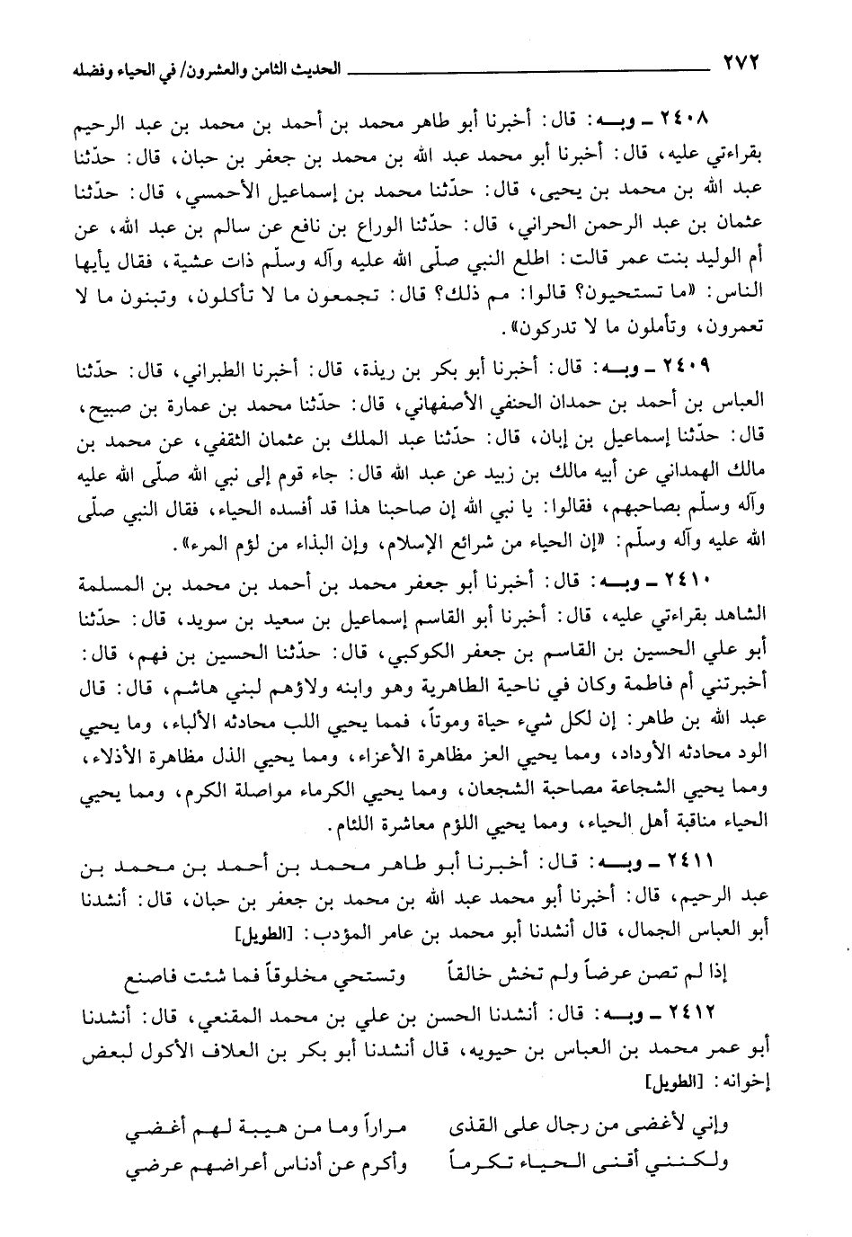 2409 - أَخْبَرَنَا أَبُو بَكْرِ بْنُ رَيْذَةَ، قَالَ: أَخْبَرَنَا الطَّبَرَانِيُّ، قَالَ: حَدَّثَنَا الْعَبَّاسُ بْنُ أَحْمَدَ بْنِ حِمْدَانَ الْحَنَفِيُّ الْأَصْفَهَانِيُّ، قَالَ: حَدَّثَنَا مُحَمَّدُ بْنُ عِمَارَةَ بْنِ صُبَيْحٍ، قَالَ: حَدَّثَنَا إِسْمَاعِيلُ بْنُ أَبَانٍ، قَالَ: حَدَّثَنَا عَبْدُ الْمَلِكِ بْنُ عُثْمَانَ الثَّقَفِيُّ، عَنْ مُحَمَّدِ بْنِ مَالِكٍ الْهَمْدَانِيِّ، عَنْ أَبِيهِ مَالِكِ بْنِ زُبَيْدٍ، عَنْ عَبْدِ اللَّهِ , قَالَ: جَاءَ قَوْمٌ إِلَى نَبِيِّ اللَّهِ صَلَّى اللَّهُ عَلَيْهِ وَآلِهِ وَسَلَّمَ بِصَاحِبِهِمْ، فَقَالُوا: يَا نَبِيَّ اللَّهِ إِنَّ صَاحِبَنَا هَذَا قَدْ أَفْسَدَهُ الْحَيَاءُ، فَقَالَ النَّبِيُّ صَلَّى اللَّهُ عَلَيْهِ وَآلِهِ وَسَلَّمَ: «إِنَّ الْحَيَاءَ مِنْ شَرَائِعِ الْإِسْلَامِ، وَإِنَّ الْبَذَاءَ مِنْ لُؤْمِ الْمَرْءِ»