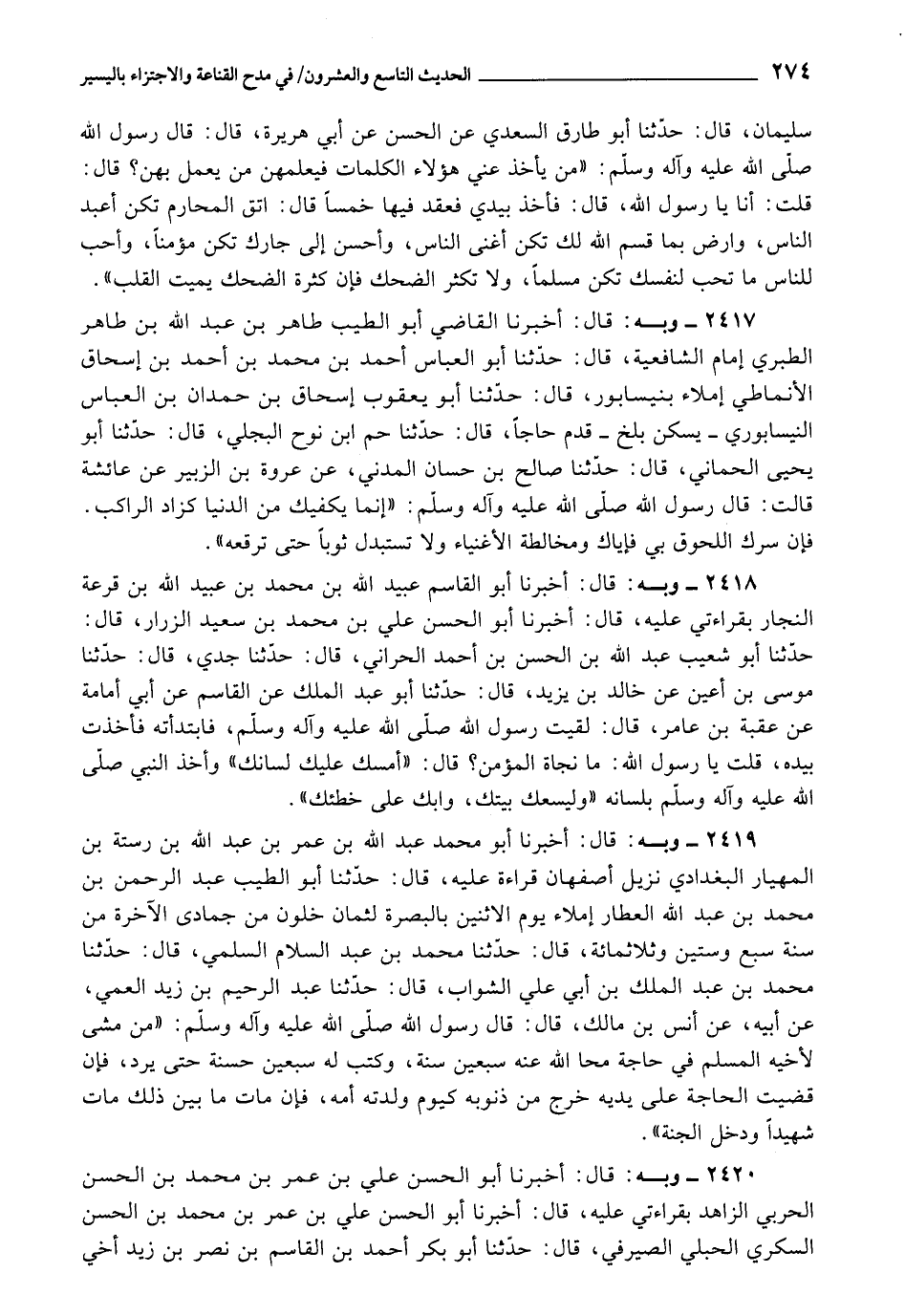 2417 - أَخْبَرَنَا الْقَاضِي أَبُو الطَّيِّبِ طَاهِرُ بْنُ عَبْدِ اللَّهِ بْنِ طَاهِرٍ الطَّبَرِيُّ إِمَامُ الشَّافِعِيَّةِ، قَالَ: حَدَّثَنَا أَبُو الْعَبَّاسِ أَحْمَدُ بْنُ مُحَمَّدِ بْنِ أَحْمَدَ بْنِ إِسْحَاقَ الْأَنْمَاطِيُّ، إِمْلَاءً بِنَيْسَابُورَ، قَالَ: حَدَّثَنَا أَبُو يَعْقُوبَ إِسْحَاقُ بْنُ حِمْدَانَ بْنِ الْعَبَّاسِ النَّيْسَابُورِيُّ بِسَكَنِ بَلْخَ قَدِمَ حَاجًّا، قَالَ: حَدَّثَنَا حَامُ بْنُ نُوحٍ الْبَجَلِيُّ، قَالَ: حَدَّثَنَا أَبُو يَحْيَى الْحَمَانِيُّ، قَالَ: حَدَّثَنَا صَالِحُ بْنُ حَسَّانٍ الْمَدَنِيُّ، عَنْ عُرْوَةَ بْنِ الزُّبَيْرِ، عَنْ عَائِشَةَ , قَالَتْ: قَالَ رَسُولُ اللَّهِ صَلَّى اللَّهُ عَلَيْهِ وَآلِهِ وَسَلَّمَ: إِنَّمَا يَكْفِيكَ مِنَ الدُّنْيَا كَزَادِ الرَّاكِبِ، فَإِنَّ سَرَّكَ اللُّحُوقُ بِي , فَإِيَّاكَ وَمُخَالَطَةَ الْأَغْنِيَاءِ، وَلَا تَسْتَبْدِلْ ثَوْبًا حَتَّى تُرَقِّعَهُ "