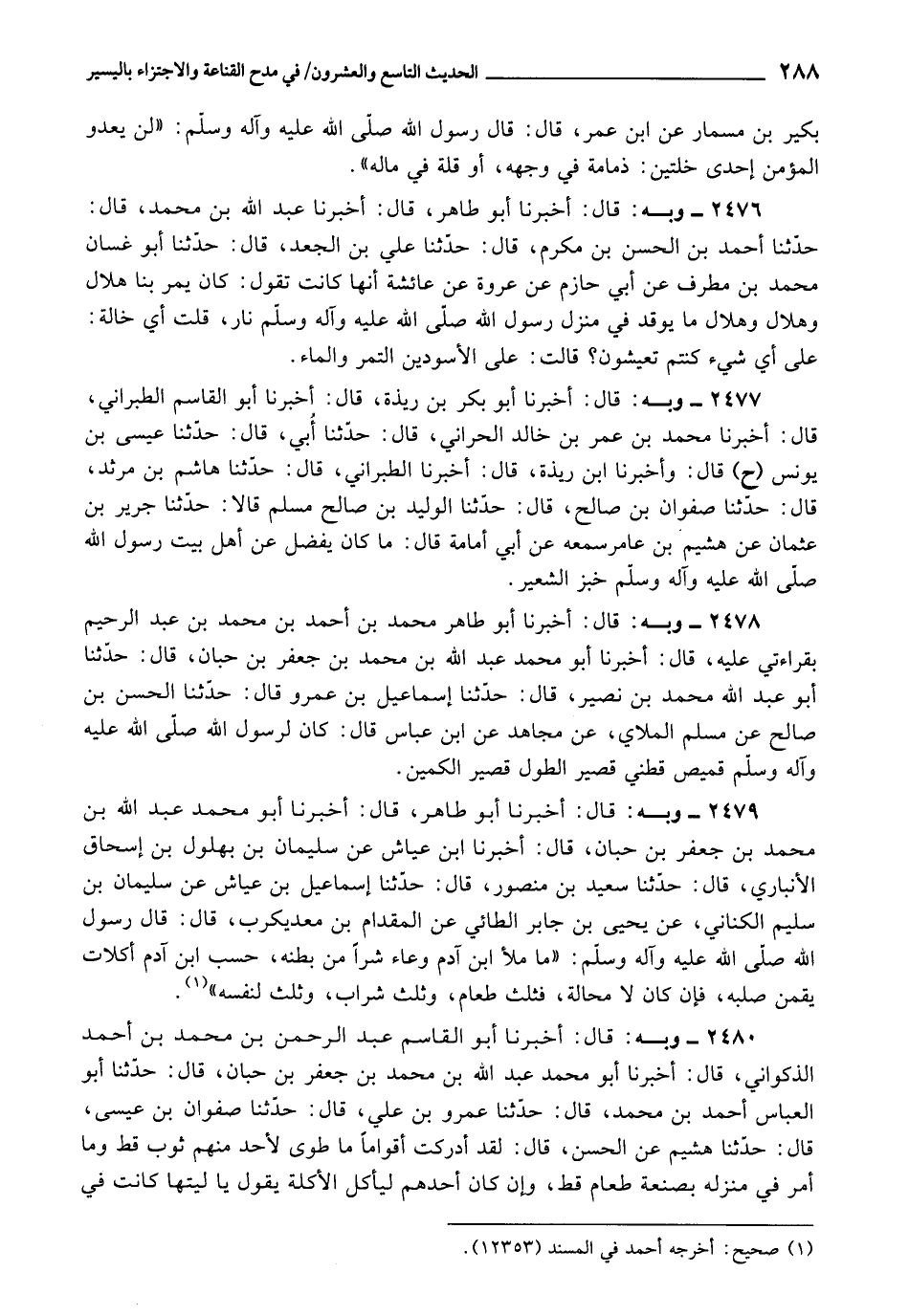 2477 - أَخْبَرَنَا أَبُو بَكْرِ بْنُ أَبِي رَيْذَةَ , قَالَ: أَخْبَرَنَا أَبُو الْقَاسِمِ الطَّبَرَانِيُّ، قَالَ: أَخْبَرَنَا مُحَمَّدُ بْنُ عُمَرَ بْنِ خَالِدٍ الْحَرَّانِيُّ، قَالَ: حَدَّثَنَا أَبِي، قَالَ: حَدَّثَنَا عِيسَى بْنُ يُونُسَ، ح قَالَ وَأَخْبَرَنَا ابْنُ رَيْذَةَ، قَالَ: أَخْبَرَنَا الطَّبَرَانِيُّ، قَالَ: حَدَّثَنَا هَاشِمُ بْنُ مَرْثَدٍ، قَالَ: حَدَّثَنَا صَفْوَانُ بْنُ صَالِحٍ، قَالَ: حَدَّثَنَا الْوَلِيدُ بْنُ صَالِحٍ مُسْلِمٌ , قَالَا: حَدَّثَنَا جَرِيرُ بْنُ عُثْمَانَ، عَنْ هُشَيْمِ بْنِ عَامِرٍ سَمِعَهُ , عَنْ أَبِي أُمَامَةَ , قَالَ: «مَا كَانَ يَفْضُلُ عَنْ أَهْلِ بَيْتِ رَسُولِ اللَّهِ صَلَّى اللَّهُ عَلَيْهِ وَآلِهِ وَسَلَّمَ خُبْزُ الشَّعِيرِ»