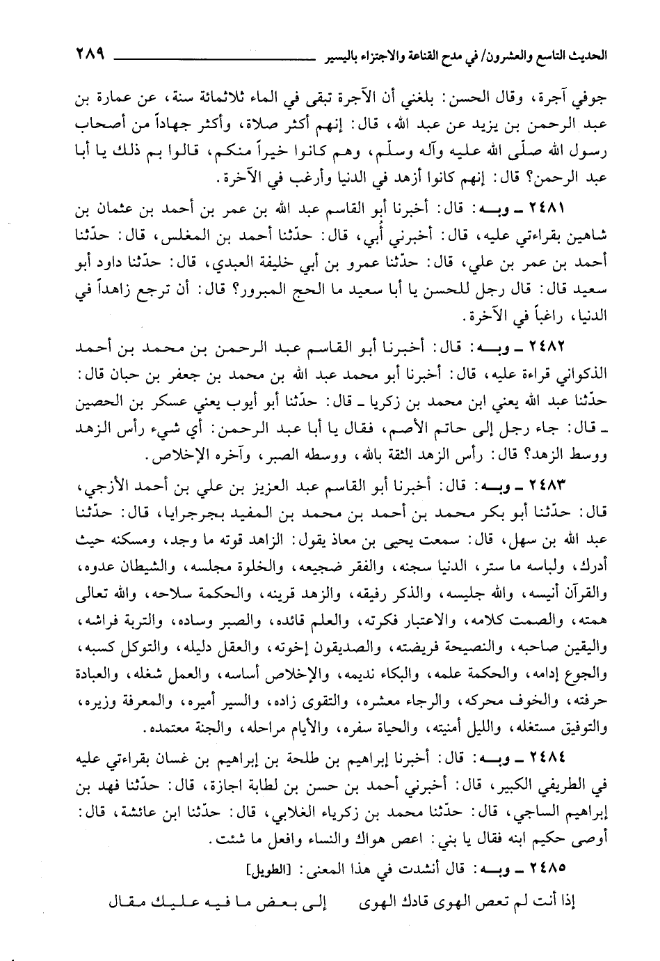 2482 - أَخْبَرَنَا أَبُو الْقَاسِمِ عَبْدُ الرَّحْمَنِ بْنُ مُحَمَّدِ بْنِ أَحْمَدَ الذَّكْوَانِيُّ قِرَاءَةً عَلَيْهِ، قَالَ: أَخْبَرَنَا أَبُو مُحَمَّدٍ عَبْدُ اللَّهِ بْنُ مُحَمَّدِ بْنِ جَعْفَرِ بْنِ حِبَّانَ، قَالَ: حَدَّثَنَا عَبْدُ اللَّهِ يَعْنِي ابْنَ مُحَمَّدِ بْنِ زَكَرِيَّا - قَالَ: حَدَّثَنَا أَبُو أَيُّوبَ يَعْنِي عَسْكَرَ بْنَ الْحُصَيْنِ - قَالَ: جَاءَ رَجُلٌ إِلَى حَاتِمٍ الْأَصَمِّ، فَقَالَ يَا أَبَا عَبْدِ الرَّحْمَنِ: أَيُّ شَيْءٍ رَأْسُ الزُّهْدِ وَوَسَطُ الزُّهْدِ؟ قَالَ: رَأْسُ الزُّهْدِ الثِّقَةُ بِاللَّهِ، وَوَسَطُهُ الصَّبْرُ، وآخِرُهُ الْإِخْلَاصُ.