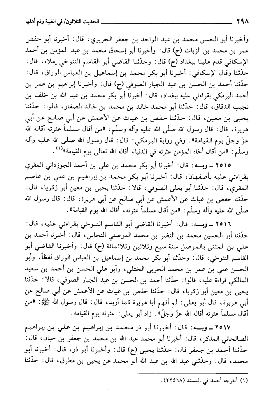 قَالَ: وَأَخْبَرَنَا الْقَاضِي أَبُو الْقَاسِمِ التَّنُوخِيُّ، قَالَ: وحَدَّثَنَا أَبُو بَكْرٍ مُحَمَّدُ بْنُ إِسْمَاعِيلَ بْنِ الْعَبَّاسِ الْوَرَّاقُ لَفْظًا، وَأَبُو الْحَسَنِ عَلِيُّ بْنُ عُمَرَ بْنِ مُحَمَّدٍ الْحَرْبِيُّ الْخُتُّلِيُّ، وَأَبُو عَلِيٍّ الْحَسَنُ بْنُ أَحْمَدَ بْنِ سَعِيدٍ الْمَالِكِيُّ قِرَاءَةً عَلَيْهِ، قَالُوا: حَدَّثَنَا أَحْمَدُ بْنُ الْحَسَنِ بْنِ عَبْدِ الْجَبَّارِ الصُّوفِيُّ، قَالَا: حَدَّثَنَا يَحْيَى بْنُ مَعِينٍ أَبُو زَكَرِيَّا، قَالَ: حَدَّثَنَا حَفْصُ بْنُ غِيَاثٍ، عَنِ الْأَعْمَشِ، عَنْ أَبِي صَالِحٍ، عَنْ أَبِي هُرَيْرَةَ، قَالَ أَبُو يَعْلَى: لَمْ أَفْهَمْ أَبَا هُرَيْرَةَ كَمَا أُرِيدُ، قَالَ: قَالَ رَسُولُ اللَّهِ صَلَّى اللَّهُ عَلَيْهِ وَآلِهِ وَسَلَّمَ: «مَنْ أقَالَ مُسْلِمًا عَثْرَتَهُ أَقَالَهُ اللَّهُ عَزَّ وَجَلَّ» .