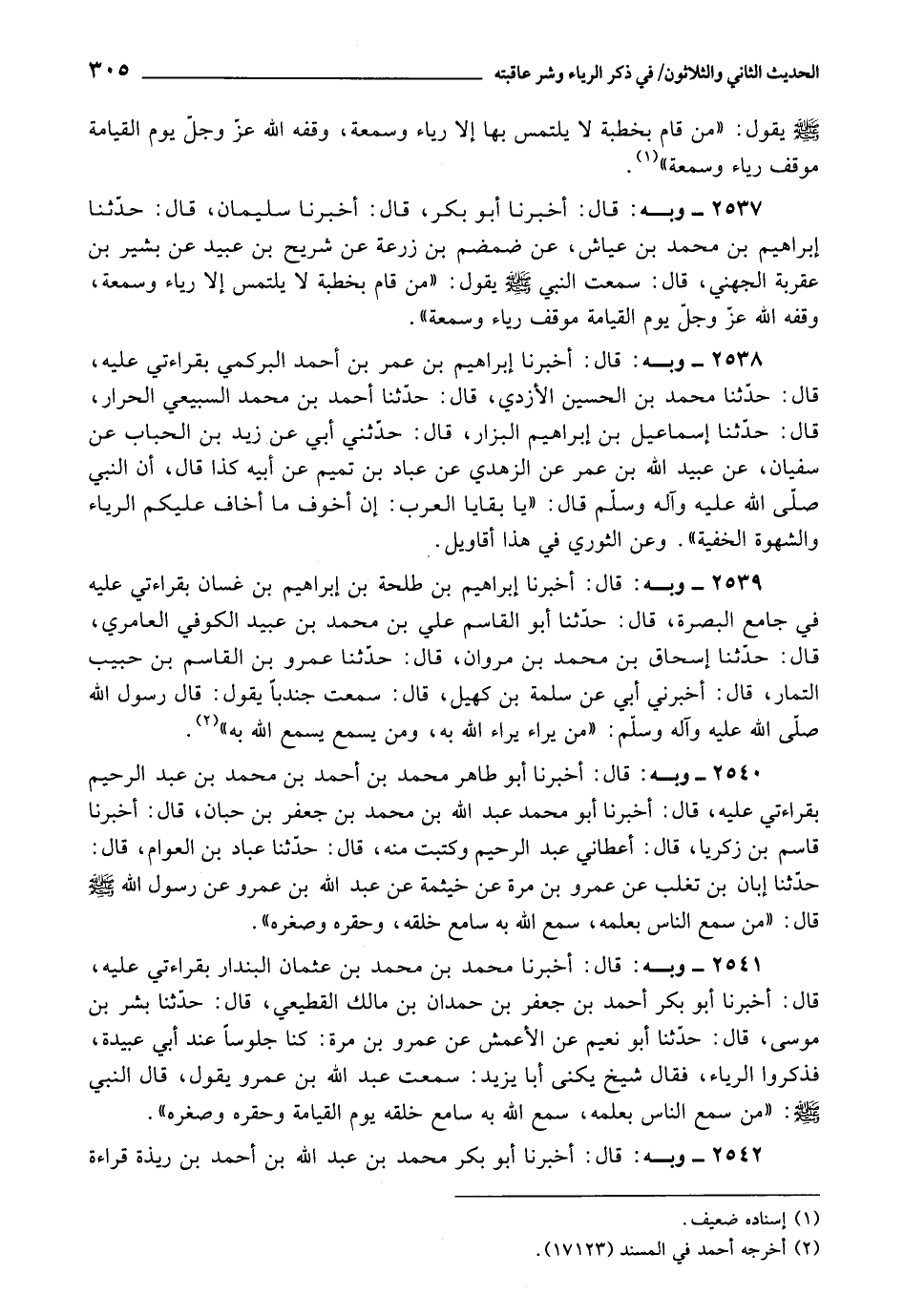 2540 - أَخْبَرَنَا أَبُو طَاهِرٍ مُحَمَّدُ بْنُ أَحْمَدَ بْنِ مُحَمَّدِ بْنِ عَبْدِ الرَّحِيمِ بِقِرَاءَتِي عَلَيْهِ، قَالَ: أَخْبَرَنَا أَبُو مُحَمَّدٍ عَبْدُ اللَّهِ بْنُ مُحَمَّدِ بْنِ جَعْفَرِ بْنِ حِبَّانَ، قَالَ: أَخْبَرَنَا قَاسِمُ بْنُ زَكَرِيَّا، قَالَ: أَعْطَانِي عَبْدُ الرَّحِيمِ وَكَتَبْتُ مِنْهُ، قَالَ: حَدَّثَنَا عَبَّادُ بْنُ الْعَوَّامِ، قَالَ: حَدَّثَنَا إِبَّانُ بْنُ تَغْلِبَ، عَنْ عَمْرِو بْنِ مُرَّةَ، عَنْ خَيْثَمَةَ، عَنْ عَبْدِ اللَّهِ بْنِ عَمْرٍو، عَنْ رَسُولِ اللَّهِ صَلَّى اللَّهُ عَلَيْهِ وَسَلَّمَ قَالَ: «مَنْ سَمَّعَ النَّاسَ بِعِلْمِهِ، سَمَّعَ اللَّهُ بِهِ سَامِعَ خَلْقِهِ، وَحَقَّرَهُ وَصَغَّرَهُ»