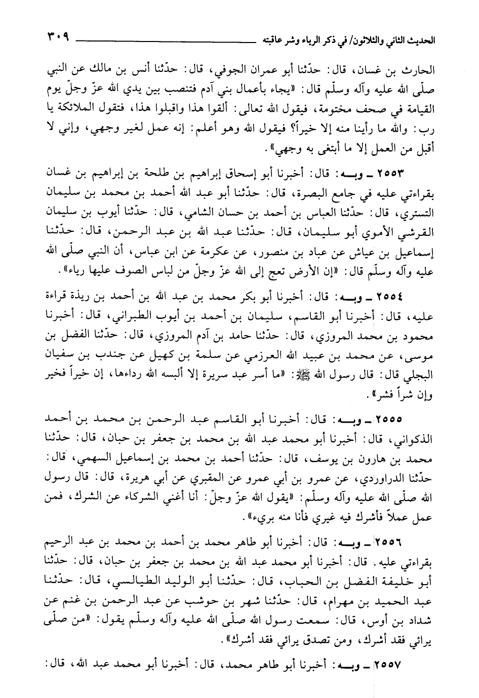 2556 - أَخْبَرَنَا أَبُو طَاهِرٍ مُحَمَّدُ بْنُ أَحْمَدَ بْنِ مُحَمَّدِ بْنِ عَبْدِ الرَّحِيمِ , بِقِرَاءَتِي عَلَيْهِ، قَالَ: أَخْبَرَنَا أَبُو مُحَمَّدٍ عَبْدُ اللَّهِ بْنُ مُحَمَّدِ بْنِ جَعْفَرِ بْنِ حِبَّانَ، قَالَ: حَدَّثَنَا أَبُو خَلِيفَةَ الْفَضْلُ بْنُ الْحَبَّابِ، قَالَ: حَدَّثَنَا أَبُو الْوَلِيدِ الطَّيَالِسِيُّ، قَالَ: حَدَّثَنَا عَبْدُ الْحَمِيدِ بْنُ مِهْرَامٍ، قَالَ: حَدَّثَنَا شَهْرُ بْنُ حَوْشَبٍ، عَنْ عَبْدِ الرَّحْمَنِ بْنِ غَنَمٍ، عَنْ شَدَّادِ بْنِ أَوْسٍ، قَالَ: سَمِعْتُ رَسُولَ اللَّهِ صَلَّى اللَّهُ عَلَيْهِ وَآلِهِ وَسَلَّمَ يَقُولُ: «مَنْ صَلَّى يُرَائِي , فَقَدْ أَشْرَكَ، وَمَنْ تَصَدَّقَ يُرَائِي فَقَدْ أَشْرَكَ»