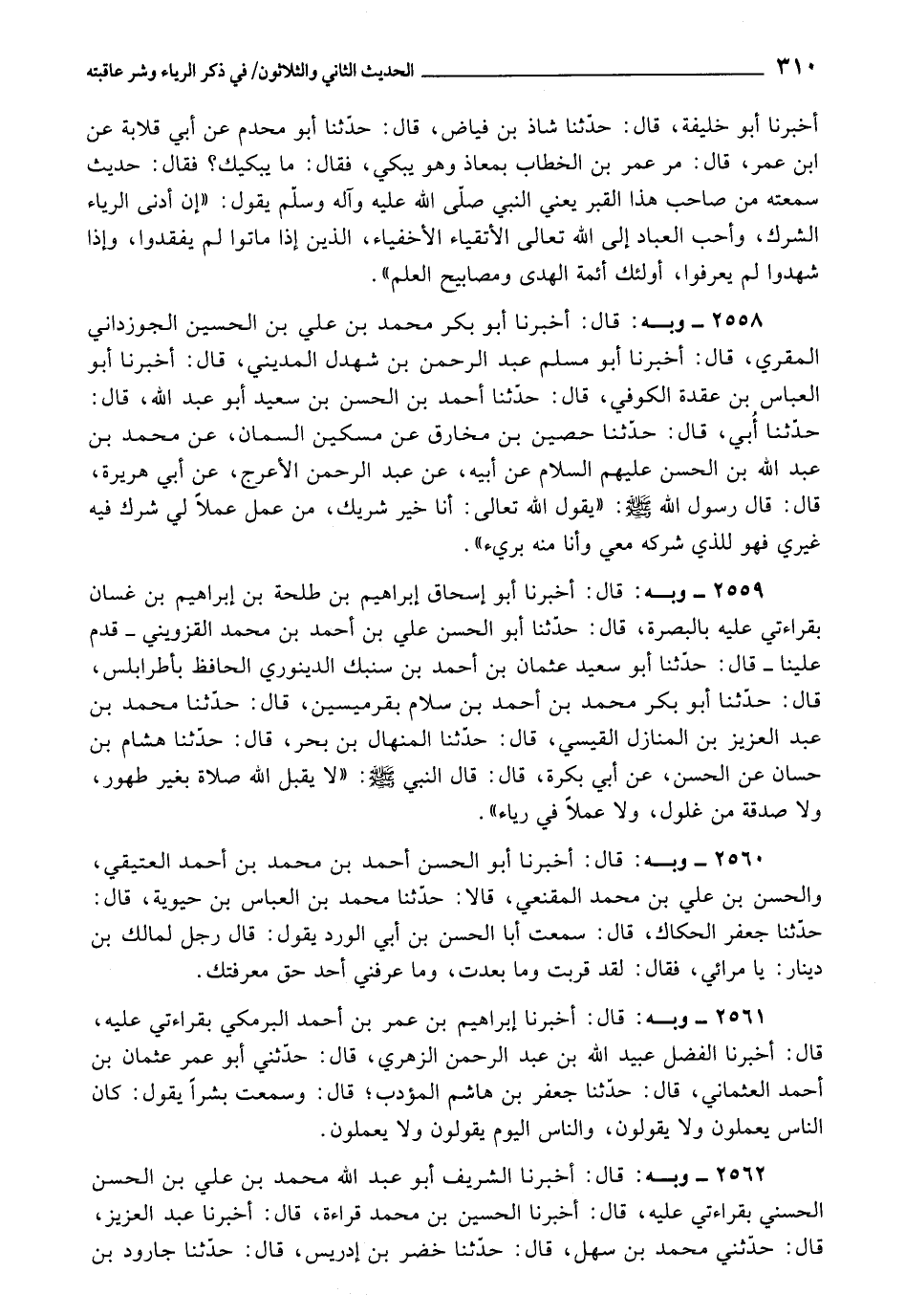 2558 - أَخْبَرَنَا أَبُو بَكْرٍ مُحَمَّدُ بْنُ عَلِيِّ بْنِ الْحُسَيْنِ الْجُوزْدَانِيُّ الْمُقْرِيُّ، قَالَ: أَخْبَرَنَا أَبُو مُسْلِمٍ عَبْدُ الرَّحْمَنِ بْنُ شَهْدَلٍ الْمَدِينِيُّ، قَالَ: أَخْبَرَنَا أَبُو الْعَبَّاسِ بْنُ عُقْدَةَ الْكُوفِيُّ، قَالَ: حَدَّثَنَا أَحْمَدُ بْنُ الْحَسَنِ بْنِ سَعِيدٍ أَبُو عَبْدِ اللَّهِ، قَالَ: حَدَّثَنَا أَبِي، قَالَ: حَدَّثَنَا حُصَيْنُ بْنُ مُخَارِقٍ، عَنْ مِسْكِينٍ السَّمَّانِ، عَنْ مُحَمَّدِ بْنِ عَبْدِ اللَّهِ بْنِ الْحَسَنِ عَلَيْهِمُ السَّلَامُ، عَنْ أَبِيهِ، عَنْ عَبْدِ الرَّحْمَنِ الْأَعْرَجِ، عَنْ أَبِي هُرَيْرَةَ، قَالَ: قَالَ رَسُولُ اللَّهِ صَلَّى اللَّهُ عَلَيْهِ وَسَلَّمَ: " يَقُولُ اللَّهُ تَعَالَى: أَنَا خَيْرُ شَرِيكٍ، مَنْ عَمِلَ عَمَلًا لِي شِرْكٌ فِيهِ غَيْرِي , فَهُوَ لِلَّذِي شَرَكَهُ مَعِيَ وَأَنَا بَرِيءٌ مِنْهُ "