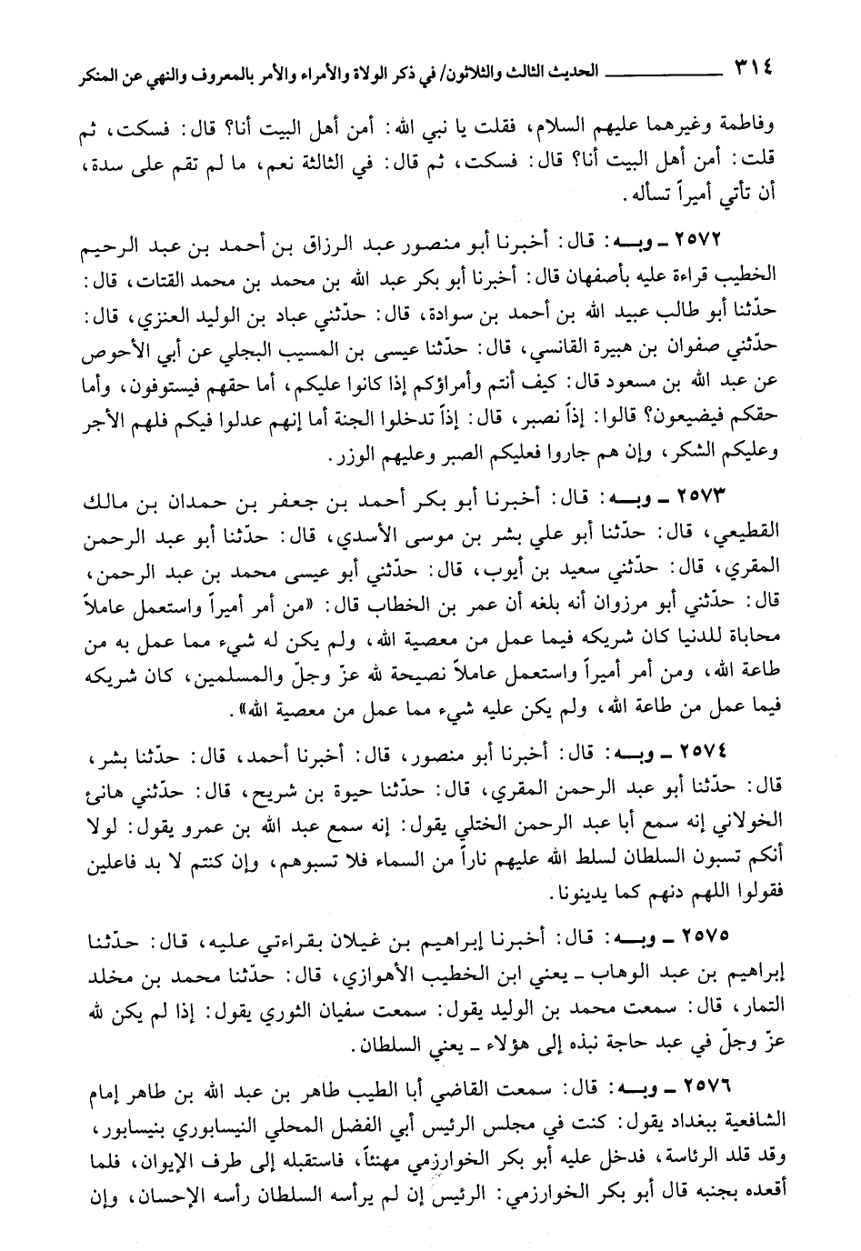 2572 - أَخْبَرَنَا أَبُو مَنْصُورٍ عَبْدُ الرَّزَّاقِ بْنُ أَحْمَدَ بْنِ عَبْدِ الرَّحِيمِ الْخَطِيبُ , قِرَاءَةً عَلَيْهِ بِأَصْفَهَانَ، قَالَ: أَخْبَرَنَا أَبُو بَكْرٍ عَبْدُ اللَّهِ بْنُ مُحَمَّدِ بْنِ مُحَمَّدٍ الْقَتَّاتُ، قَالَ: حَدَّثَنَا أَبُو طَالِبٍ عُبَيْدُ اللَّهِ بْنُ أَحْمَدَ بْنِ سَوَادَةَ، قَالَ: حَدَّثَنِي عَبَّادُ بْنُ الْوَلِيدِ الْعَنْزِيُّ، قَالَ: حَدَّثَنِي صَفْوَانُ بْنُ هَبِيرَةَ الْقَانِسِيُّ، قَالَ: حَدَّثَنَا عِيسَى بْنُ الْمُسَيِّبِ الْبَجَلِيُّ، عَنْ أَبِي الْأَحْوَصِ، عَنْ عَبْدِ اللَّهِ بْنِ مَسْعُودٍ قَالَ: " كَيْفَ أَنْتُمْ وَأُمَرَاؤُكُمْ إِذَا كَانُوا عَلَيْكُمْ، أَمَّا حَقَّهُمْ , فَيَسْتَوْفُونَ، وَأمَّا حَقَّكُمْ فَيُضَيِّعُونَ؟ قَالُوا: إِذًا نَصْبِرُ، قَالَ: إِذًا تَدْخُلُوا الْجَنَّةَ , أمَّا إِنَّهُمْ عَدَلُوا فِيكُمْ فَلَهُمُ الْأَجْرُ، وَعَلَيْكُمُ الشُّكْرُ، وَإِنْ هُمْ جَارُوا , فَعَلَيْكُمُ الصَّبْرُ , وَعَلَيْهِمُ الْوِزْرُ "